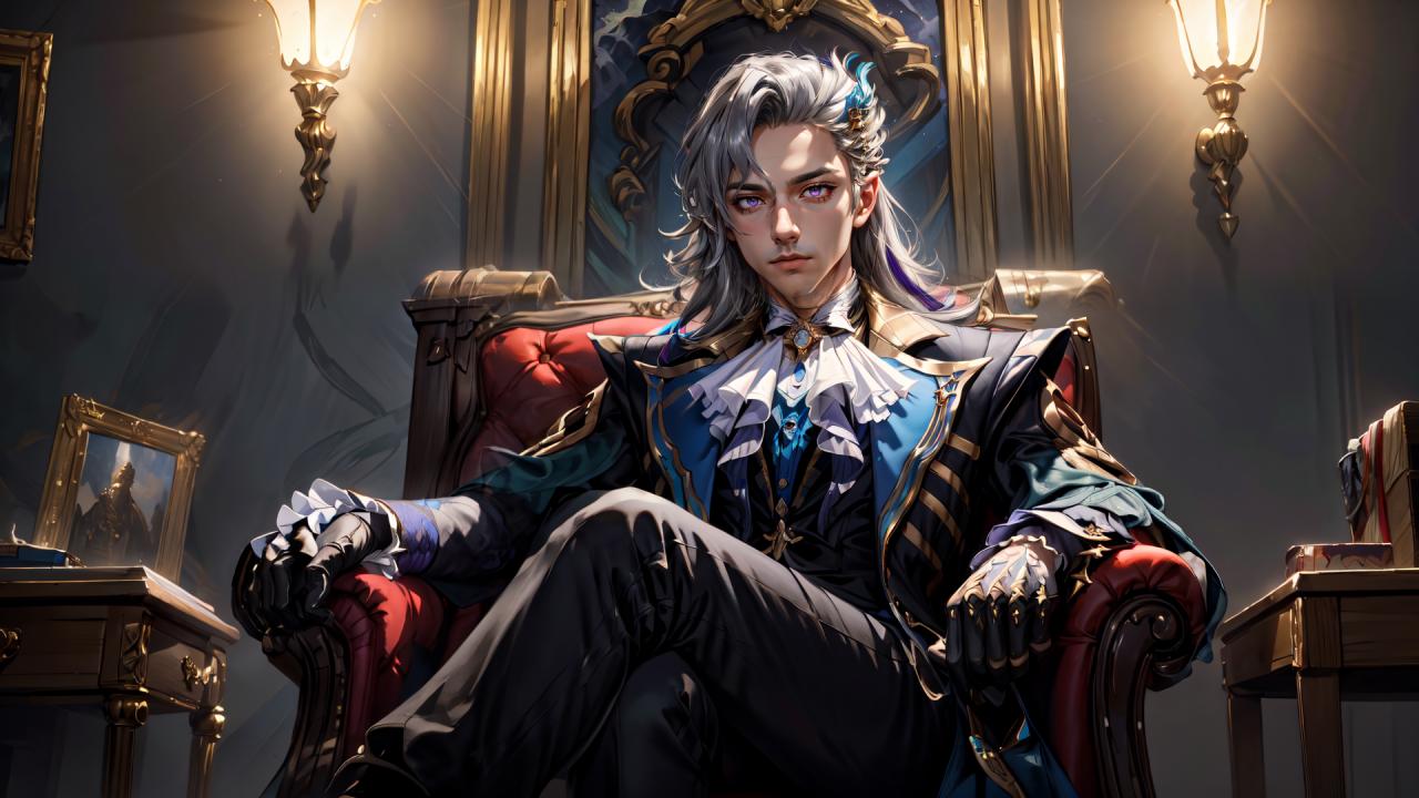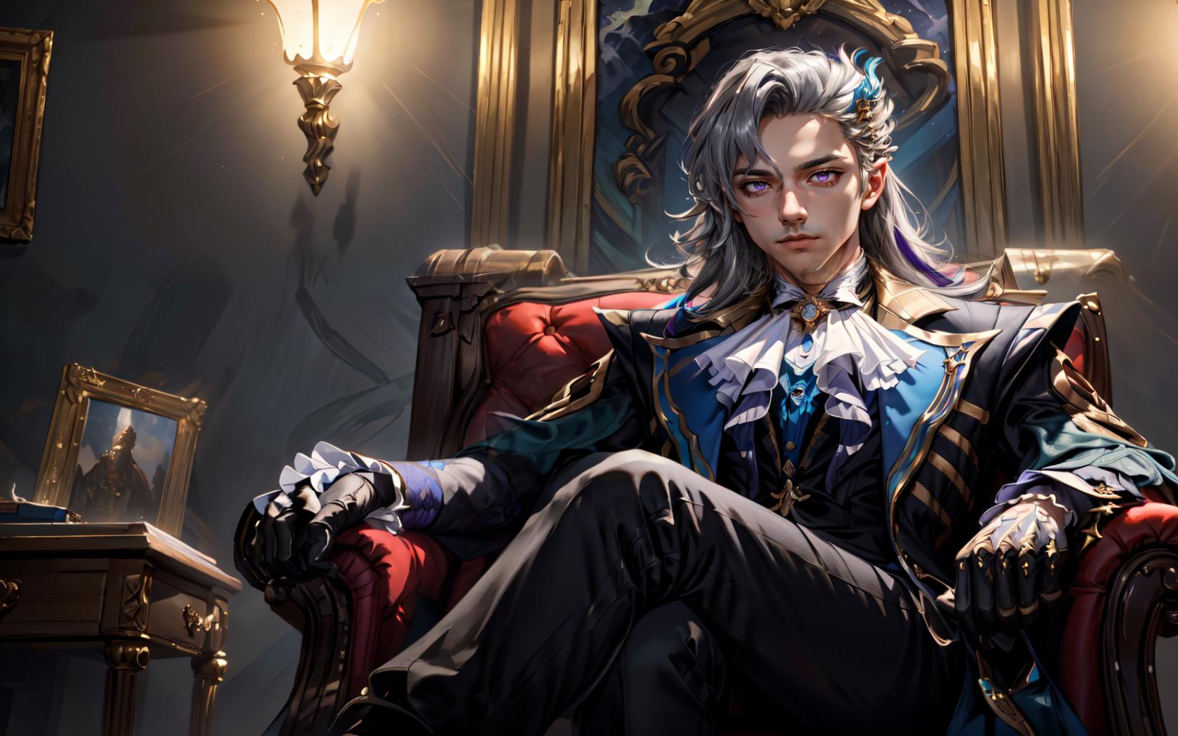 | Prompt | <lora:Neuvillette:0.7>Neuvillette, 1boy,long hair,grey hair,multicolored hair,hair ornament, purple eyes, jewelry,ascot,long sleeves, shirt,gloves, black pants,