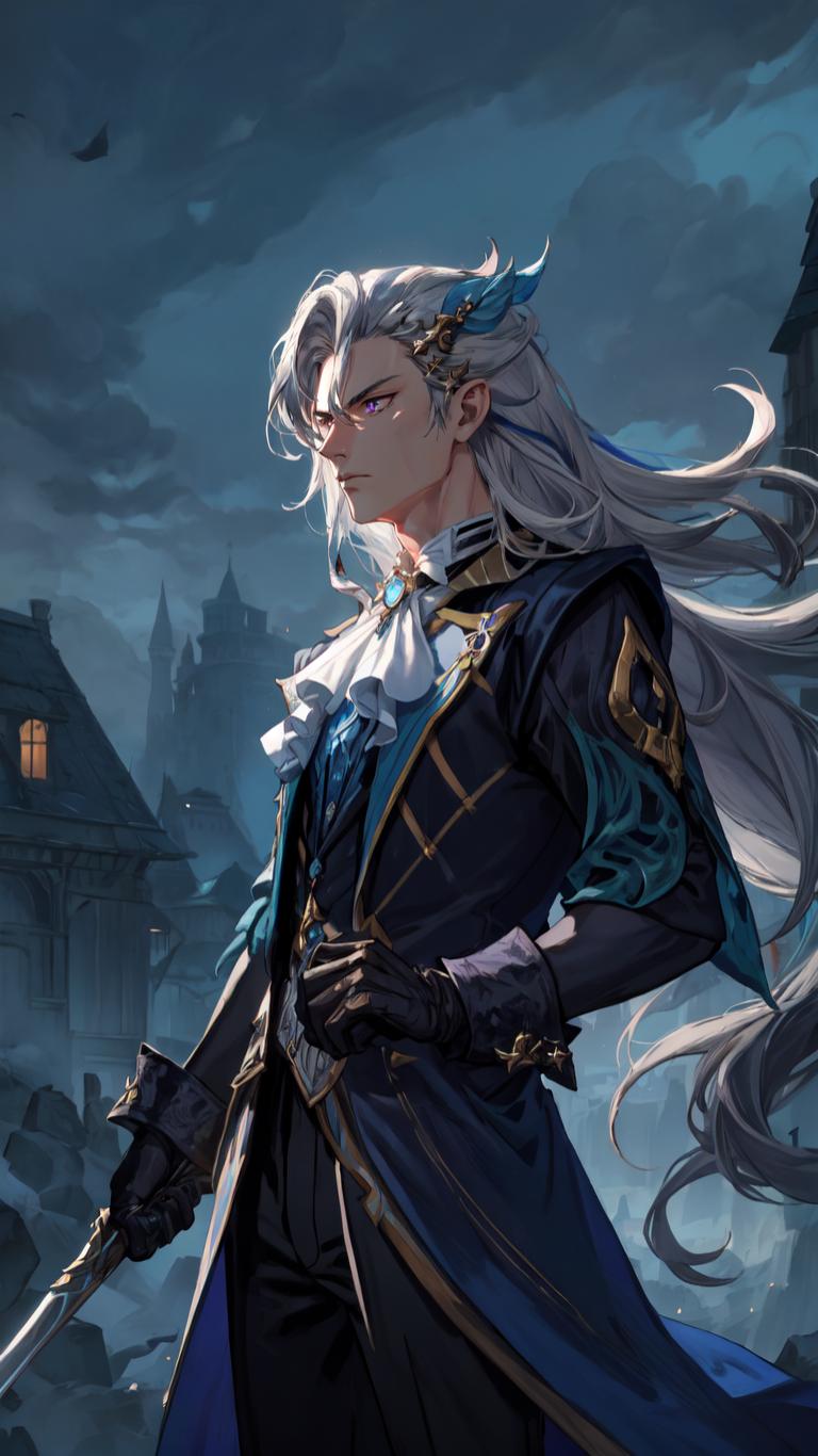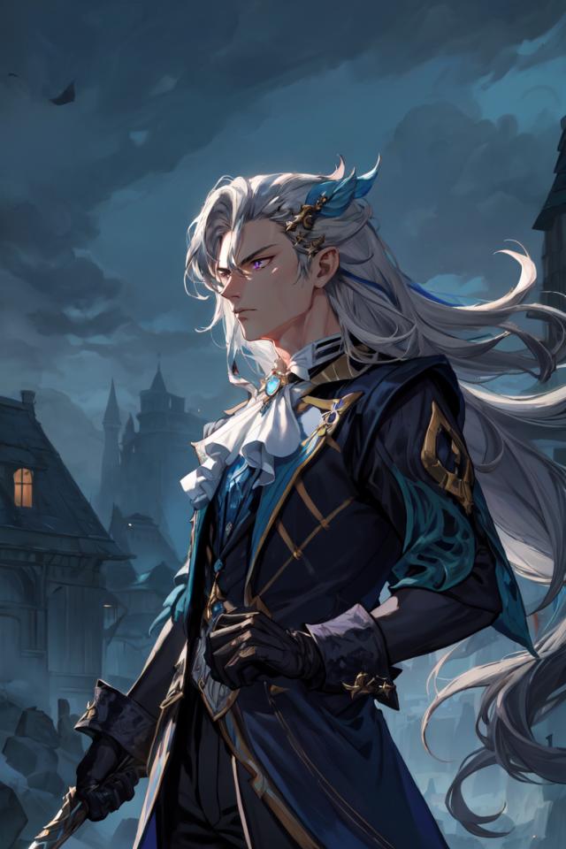 | Prompt | <lora:Neuvillette:0.7>portrait Neuvillette, 1boy,long hair,grey hair,multicolored hair,hair ornament, purple eyes, jewelry,ascot,long sleeves, shirt,gloves, black pants,