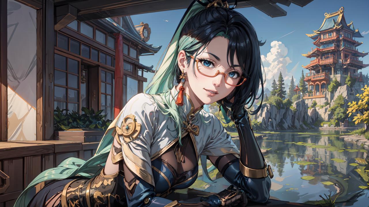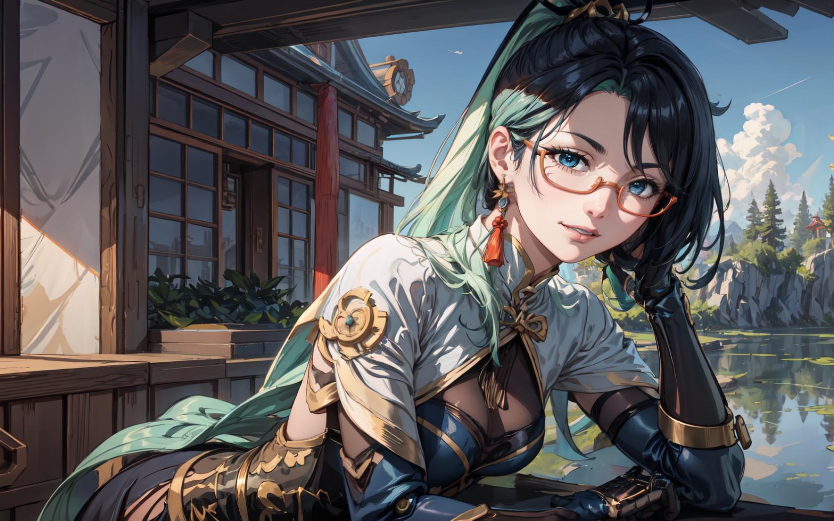 | Prompt | <lora:Xianyun:0.7> long hair, blue eyes, glasses, semi-rimless eyewear, ponytail, multicolored hair, hair ornament, earrings, chinese clothes, bodysuit, elbow gloves, dress,