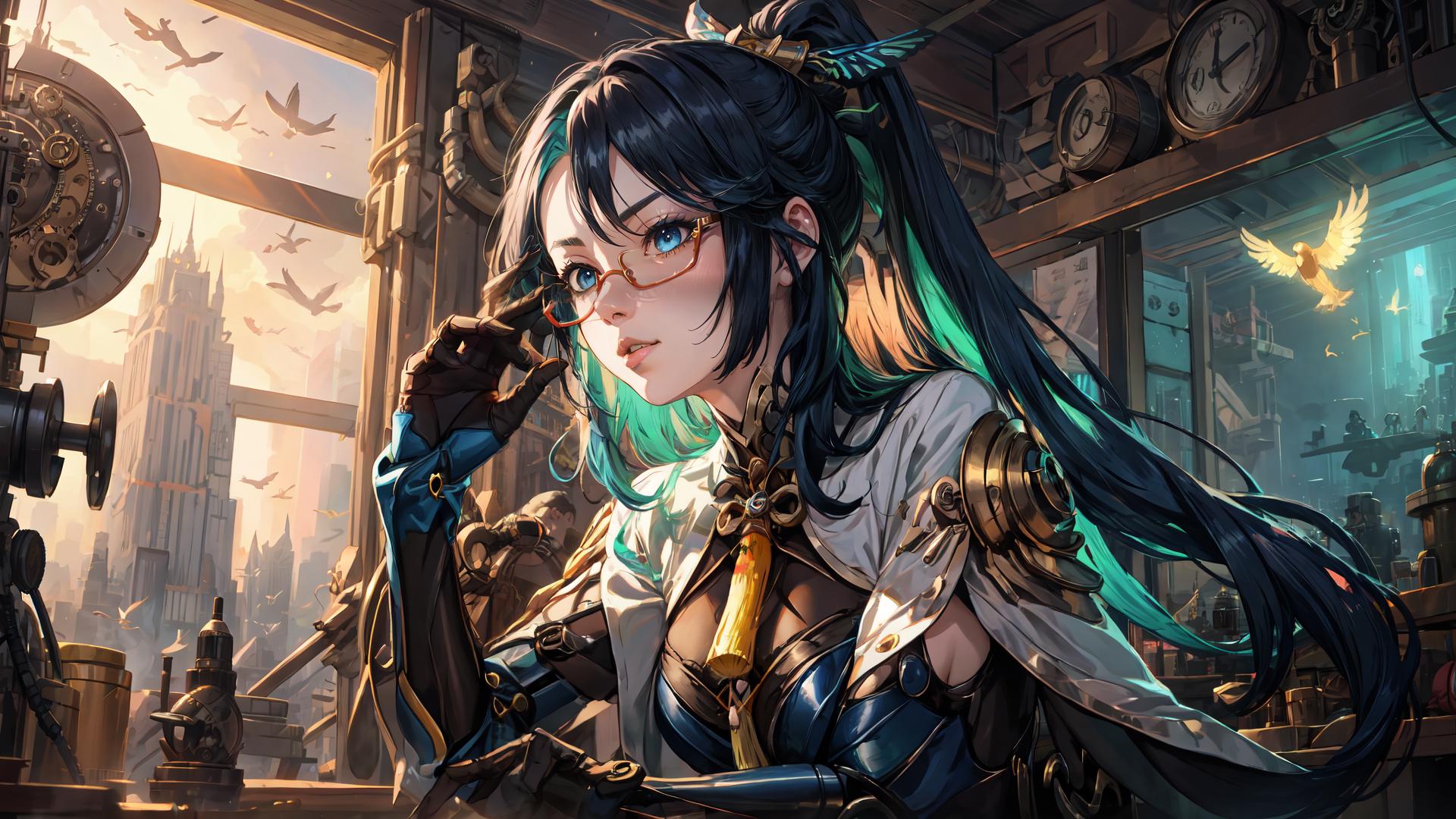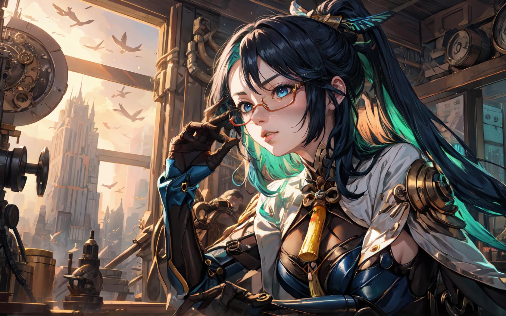 | Prompt | <lora:Xianyun:0.7> long hair, blue eyes, glasses, semi-rimless eyewear, ponytail, multicolored hair, hair ornament, earrings, chinese clothes, bodysuit, elbow gloves, dress,