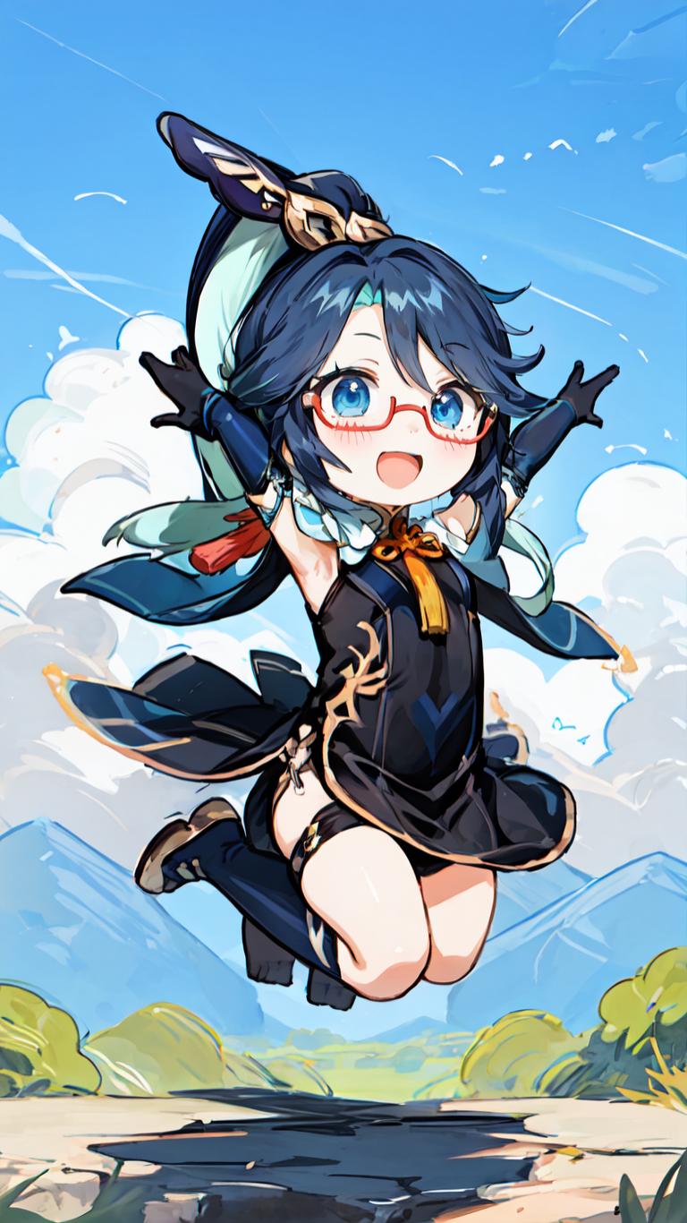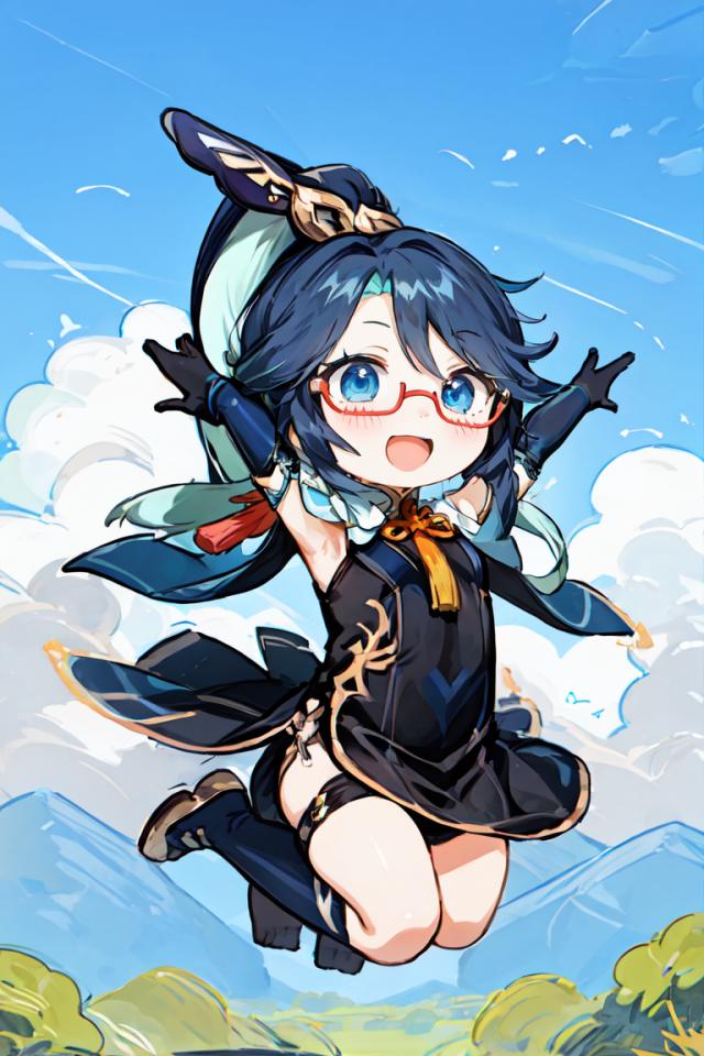 | Prompt | <lora:Xianyun:0.8> long hair, blue eyes, glasses, semi-rimless eyewear, ponytail, multicolored hair, hair ornament, earrings, chinese clothes, bodysuit, elbow gloves, dress,