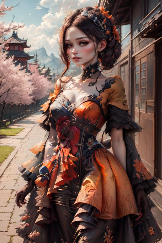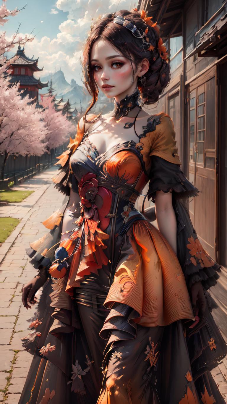 1girl, architecture, black gloves, black hair, blue sky, braid, brown eyes, brown hair, building, choker, cleavage, cloud, collarbone, day, dress, earrings, east asian architecture, eyelashes, flower, frills, gloves, hair ornament, hairband, house, jewelry, looking at viewer, medium breasts, multicolored dress, orange dress, outdoors, parted lips, realistic, short sleeves, sky, solo, standing, town, traditional clothes , tree, watermark