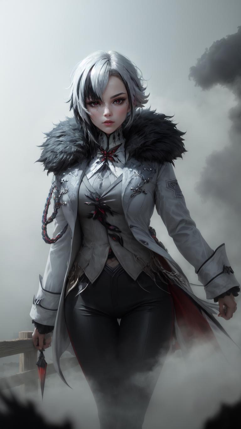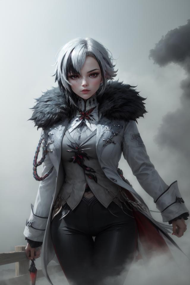 Prompt <lora:arlecchino:1> arlecchino \(genshin impact\), 1girl,grey hair, multicolored hair, short hair,black eyes, (glowing red x-shaped pupils), bangs, (black bang),fur-trimmed coat, white coat, feathers, black pants, walking to viewer,mist,fog, (majestic, proud, confident,deep intensive murderous glance), ((scornful glance)),(serious, proud, confident,aggessive, murderous), dynamic pose, motion blur, outdoors, white french medieval fantasy city background, night,