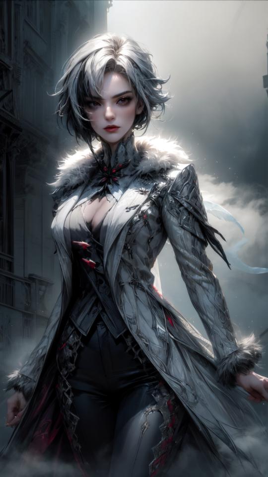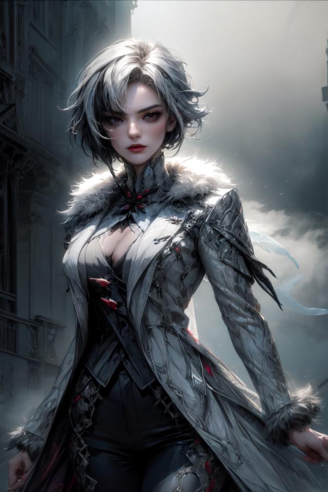 | Prompt | <lora:arlecchino:1> arlecchino \(genshin impact\), 1girl,grey hair, multicolored hair, short hair,black eyes, (glowing red x-shaped pupils), bangs, (black bang),fur-trimmed coat, white coat, feathers, black pants,