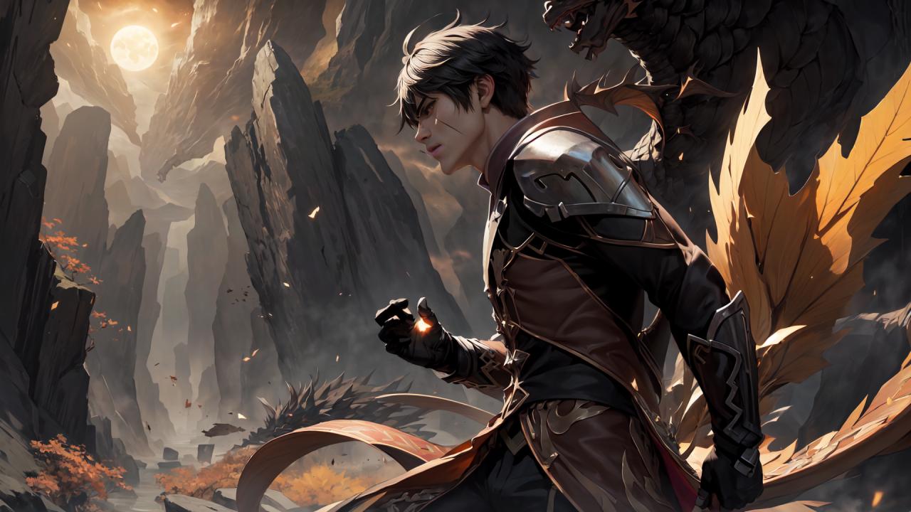 1boy, armor, bangs, black gloves, black hair, black pants, cloud, cloudy sky, coat, coattails, dragon, earrings, eastern dragon , formal, from side, full moon, gloves, hair between eyes, holding, holding polearm, holding weapon, jacket, jewelry, long sleeves, makeup, male focus, moon, mountain, multicolored hair, night, outdoors, pants, parted lips, profile, ring, shirt, short hair, shoulder armor, single earring, sky, solo, tassel, thumb ring, weapon, yellow eyes
