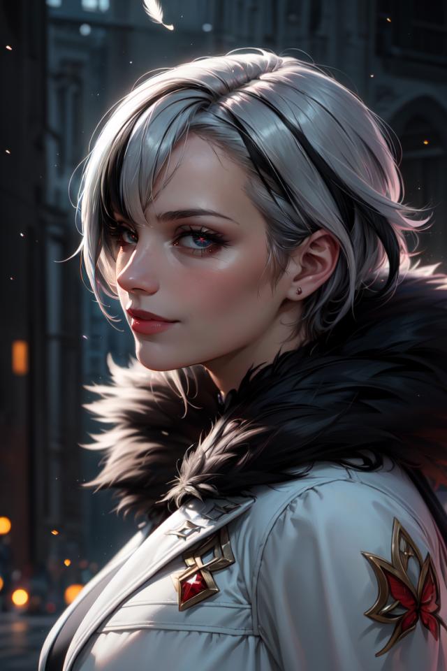 | Prompt | <lora:arlecchino:0.7> arlecchino \(genshin impact\), 1girl, grey hair,multicolored hair, short hair,black eyes, (x-shaped pupils),black gloves, long sleeves, ,black bang,