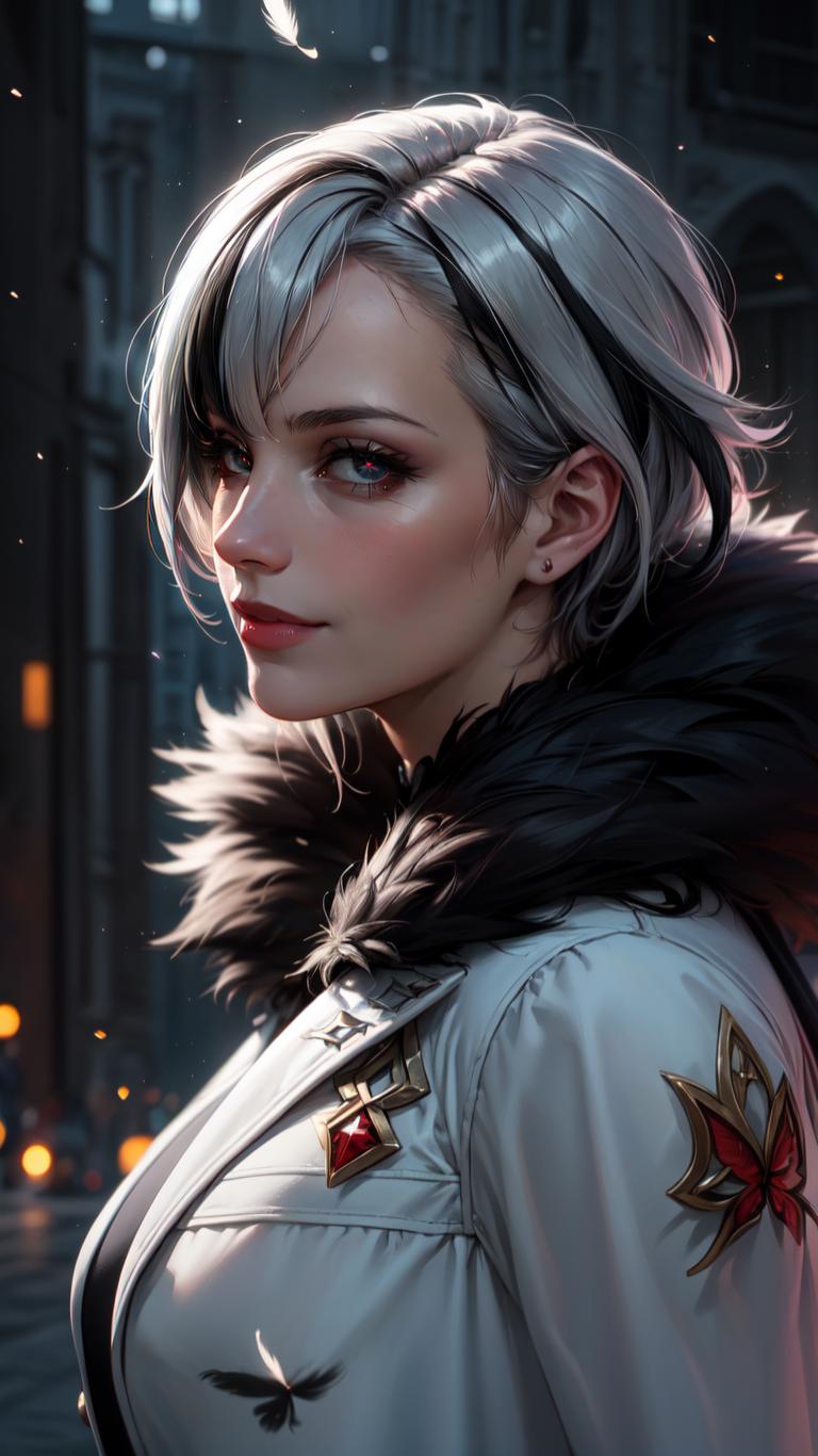 (two-tone hair, fur-trimmed coat, white coat, feathers),