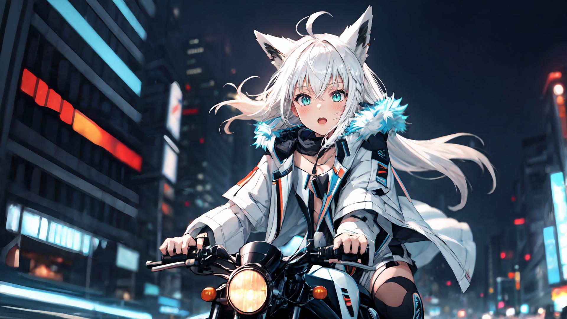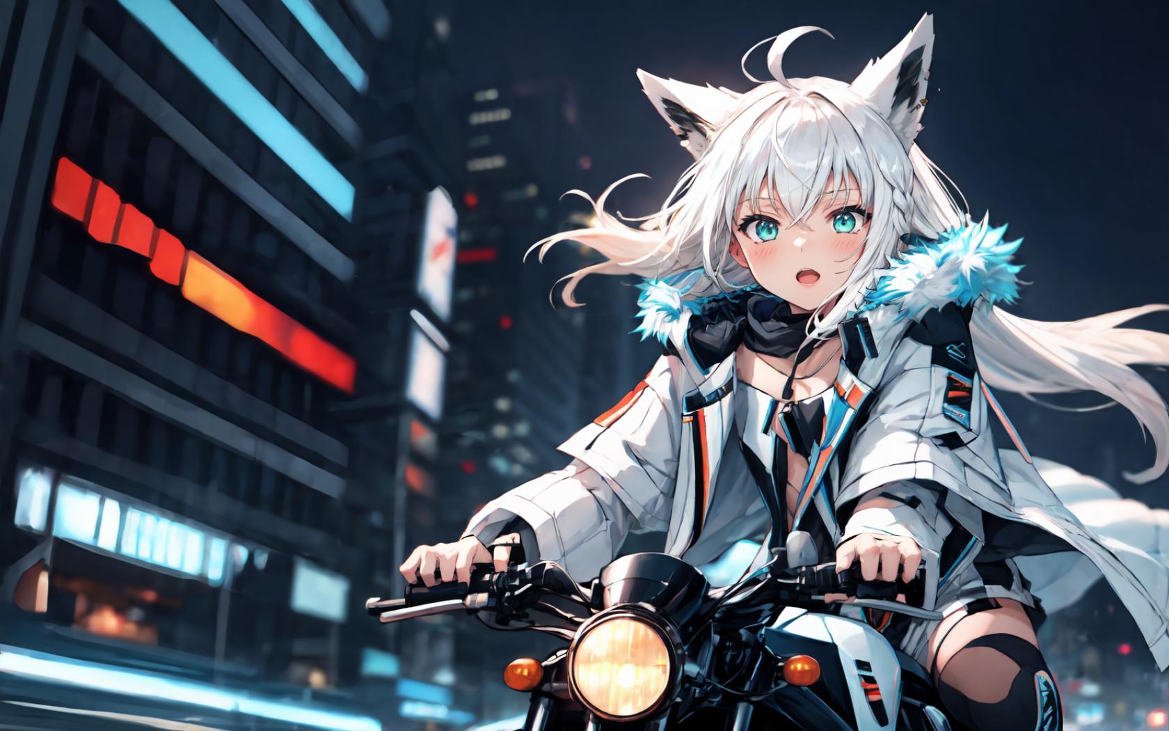 Prompt <lora:fubuker1-000007:1>techjacket1, riding futuristic motorcycle, futuristic cyberpunk background, cute,kawai,