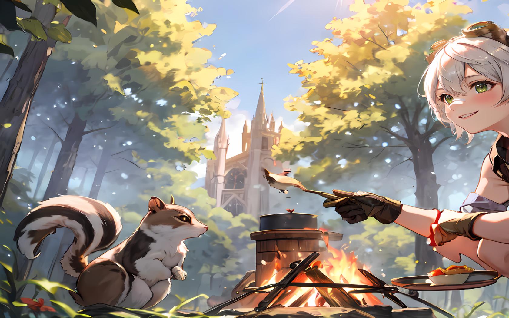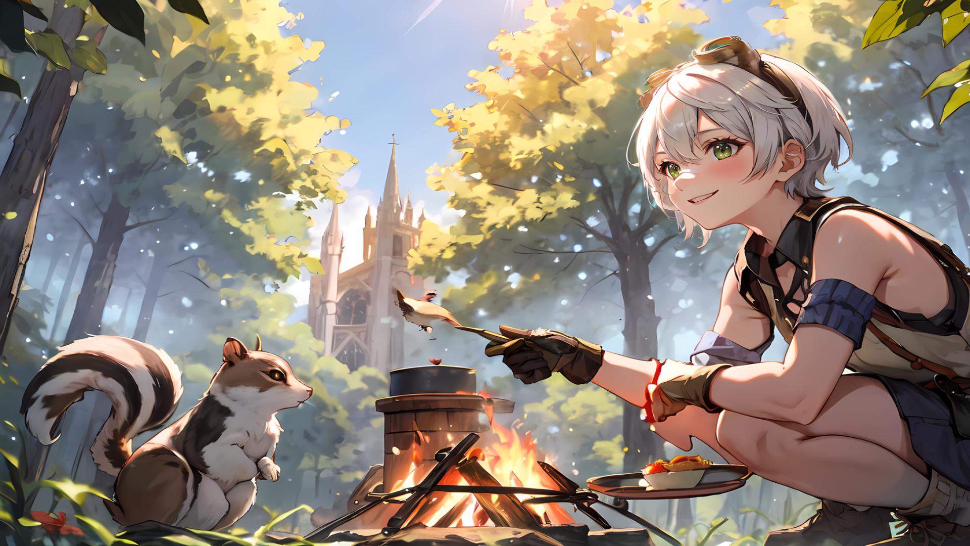 1boy, animal, bangs, bare shoulders, black gloves, blush, boots, brown footwear, campfire , cooking, day, fire, food, gloves, goggles, goggles on head, green eyes, hair between eyes, holding, leaf, male focus, nature, outdoors, shirt, short hair, shorts, skirt, sky, sleeveless, sleeveless shirt, smile, solo, squatting, tree, white hair