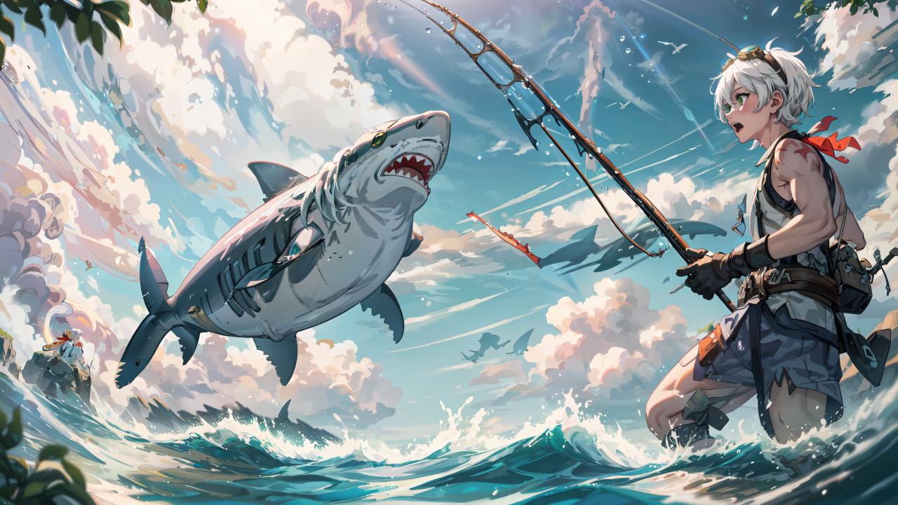 1boy, bandaid, bangs, bird, blue shorts, bow (weapon), cloud, cloudy sky, day, fish, fishing , fishing rod, gloves, goggles, goggles on head, green eyes, holding, holding weapon, male focus, multiple boys, ocean, open mouth, outdoors, scar, scar on arm, shorts, sky, sleeveless, water, weapon, white hair