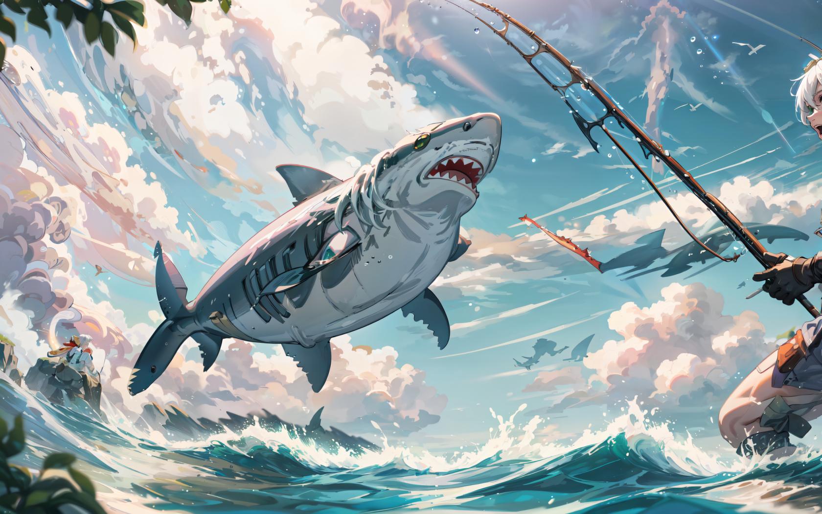 standing on rock next to a shore, (holding fishing rod, fishing), fishing a shark,