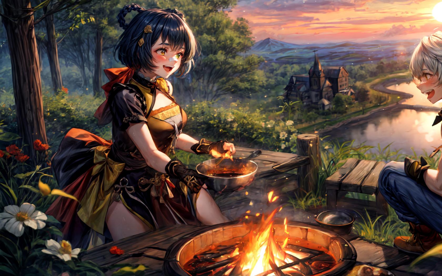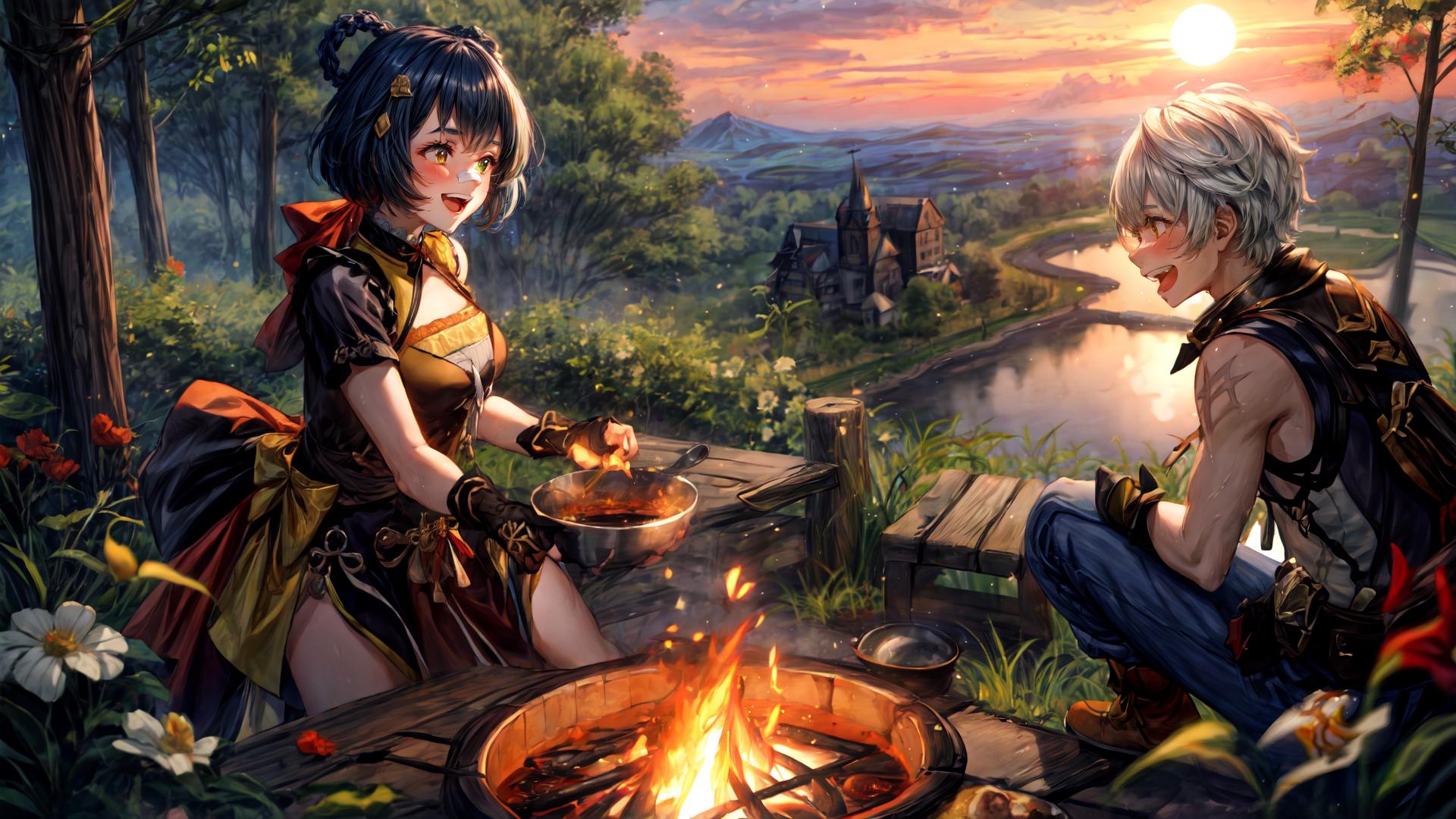 | Prompt | (1girl, 1 boy, cooking, laughing, happy), campfire, in the wild, sunset, spring,flowers, stream,(forest), ((white fortified town far away with a cathedral summit)), (friendly wildlife), birds, squirrels, (romanticism:1.3), best quality,sharp focus,(8k), (4k),(Masterpiece), (Best Quality), extremely detailed, intricate, hyper detailed, (perfect face), ray tracing, light particles, <lora:more_details:0.2> ADDCOMM <lora:xiangling1:0.8> xianglingdef, black hair,buns,guoba, ADDCOL <lora:bennett:0.8>1boy, male focus, green eyes,black gloves, bandaid, goggles, bandaid on face, solo, goggles on head, bandaid on nose, , sleeveless, white hair, |
