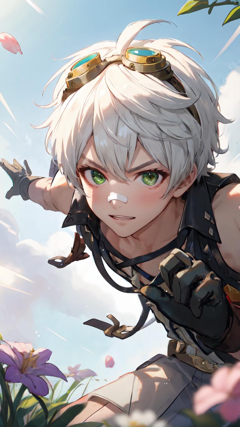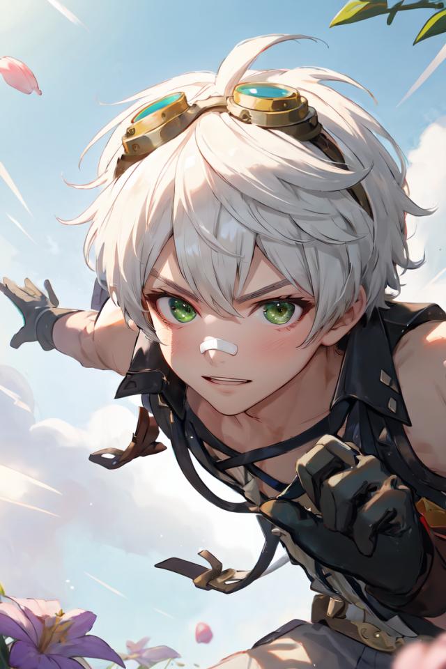 | Prompt | <lora:bennett:1>1boy, male focus, green eyes,black gloves, bandaid, goggles, bandaid on face, solo, goggles on head, bandaid on nose, , sleeveless, white hair,