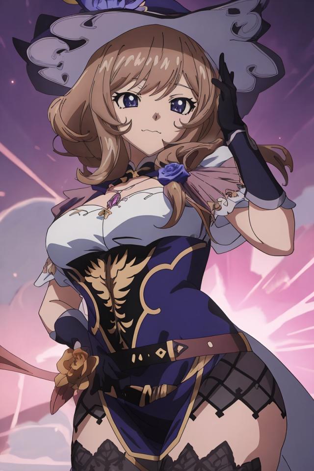 1girl, bangs, belt, black gloves, black thighhighs, brown hair, cleavage, dress, flower, gloves, hair flower, hair ornament, hand on hip, hat, hat flower, large breasts, long hair, looking at viewer, purple flower, purple headwear, purple rose , rose, smile, solo, thighhighs, vision (genshin impact), witch hat