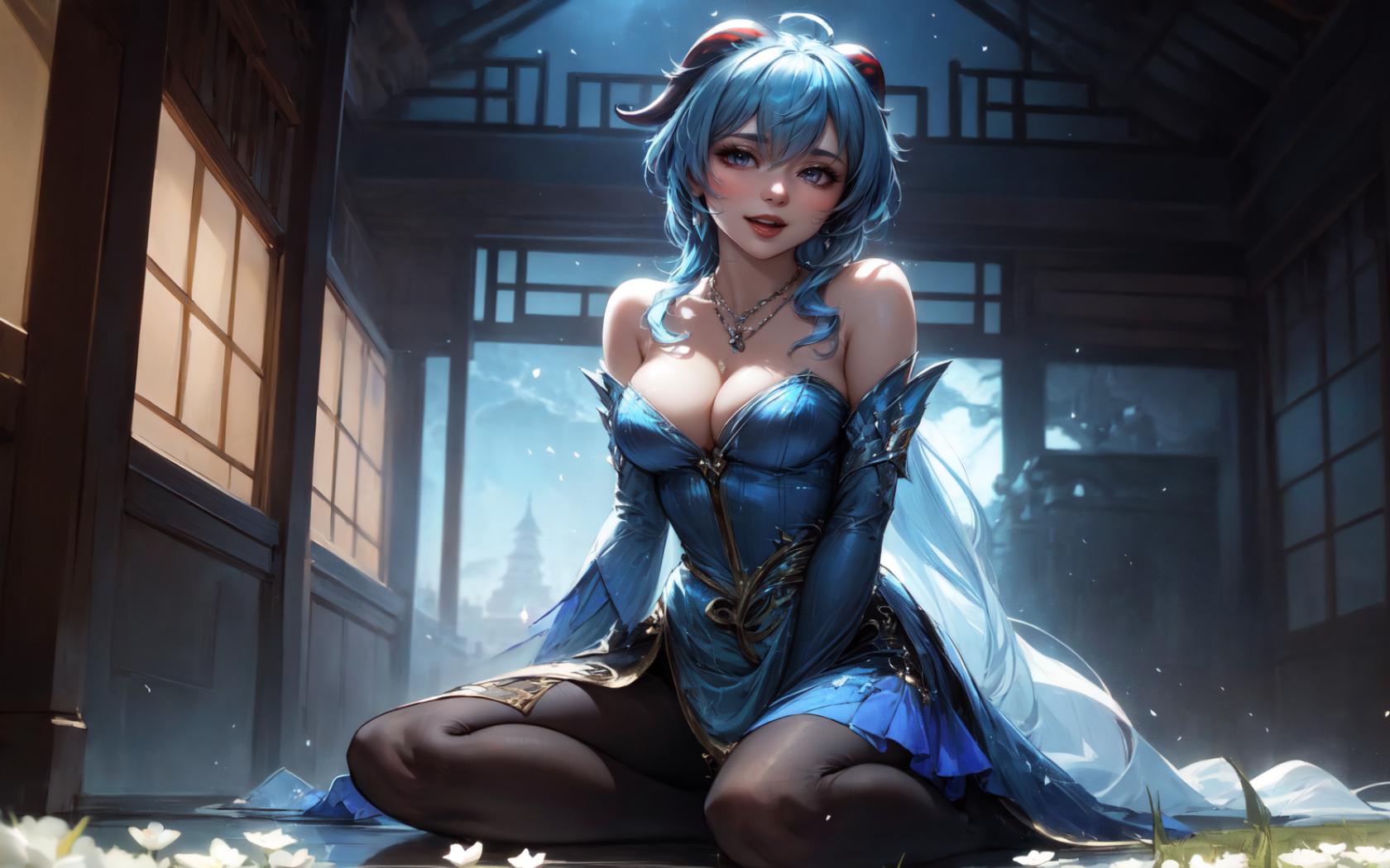 1girl, :d, ahoge, alternate costume, architecture, bangs, bare shoulders, between legs, black pantyhose, blue dress, blue eyes, blue hair, blush, cleavage, detached sleeves, dress, elbow gloves, flower, gloves, goat horns , hair between eyes, hand between legs, horns, indoors, jewelry, large breasts, long hair, looking at viewer, medium breasts, necklace, night, on floor, open mouth, pantyhose, purple eyes, sidelocks, sitting, sky, smile, solo, strapless, strapless dress, upper teeth only, very long hair, white flower, window, yokozuwari