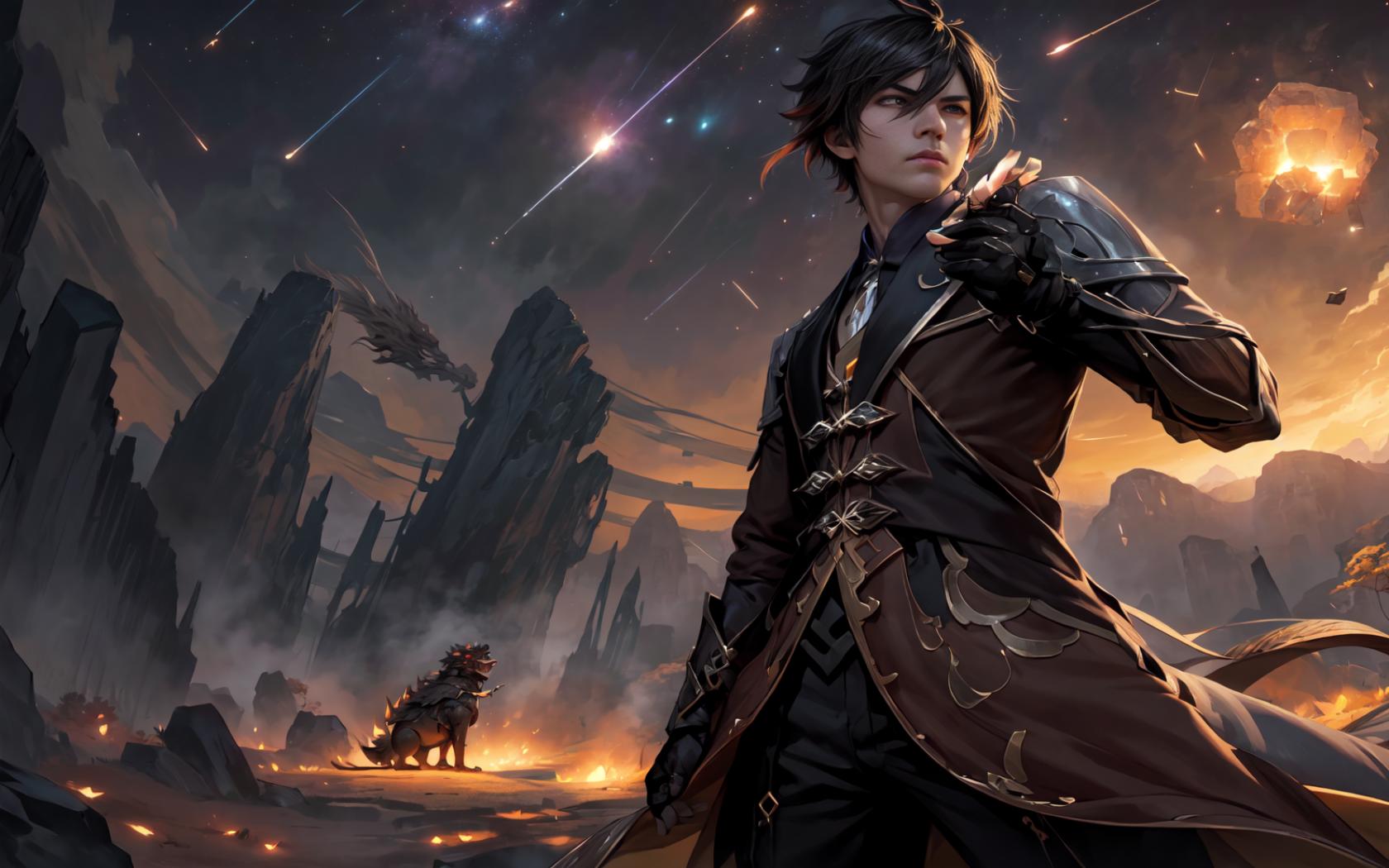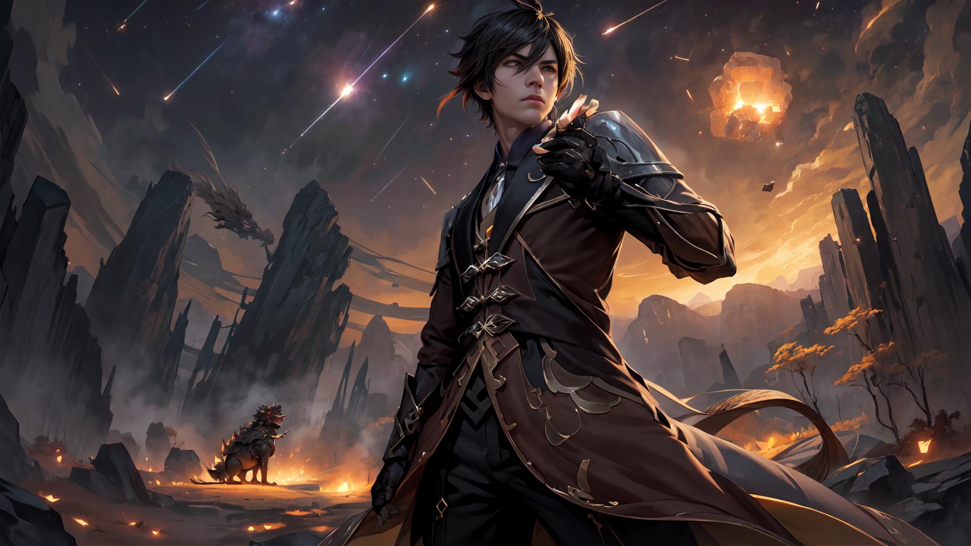 1boy, armor, bangs, black gloves, black hair, brown hair, closed mouth, cloud, cloudy sky, collared shirt, earrings, formal, gloves, glowing, gradient hair, hair between eyes, holding, holding weapon, jacket, jewelry, long hair, long sleeves, male focus, mountain, multicolored hair, necktie, night, night sky, orange hair, outdoors, pants, polearm, ponytail, rock, shirt, shooting star, single earring, sky, spear, standing, star (sky), starry sky, suit, tassel, tassel earrings, thumb ring , weapon, yellow eyes