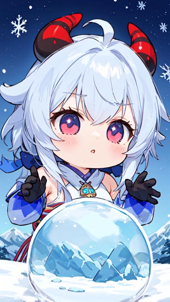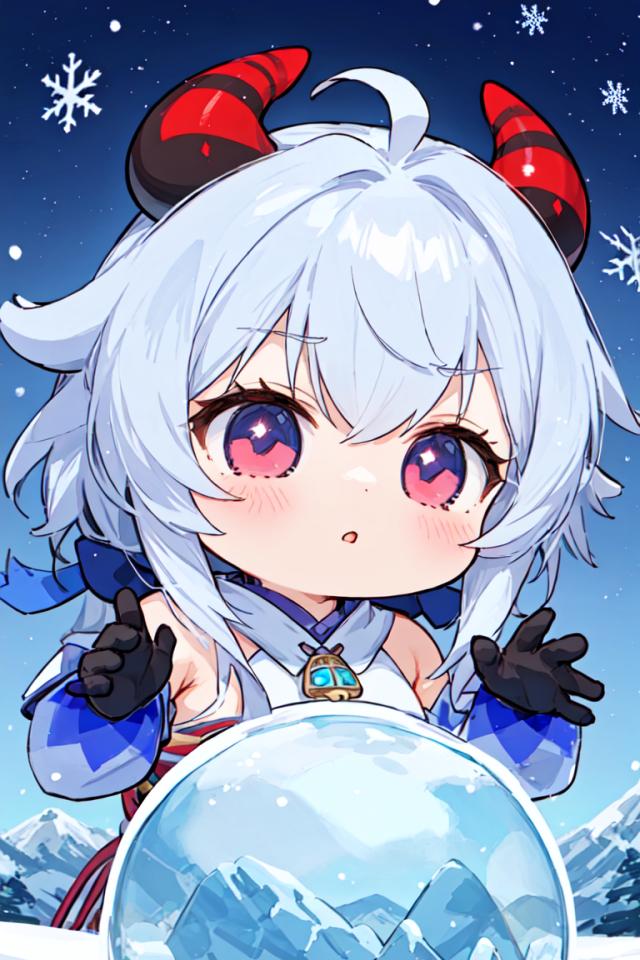 Prompt <lora:ganyu2:0.9> ganyudef, upper body,red horns, ((aesthetic heroic pose)), ( depth of field), majestic, powerful, focused,parted lips,cute, night, snow, snowflakes, wind, (giant frozen ice orb) above her head, snowy mountains,