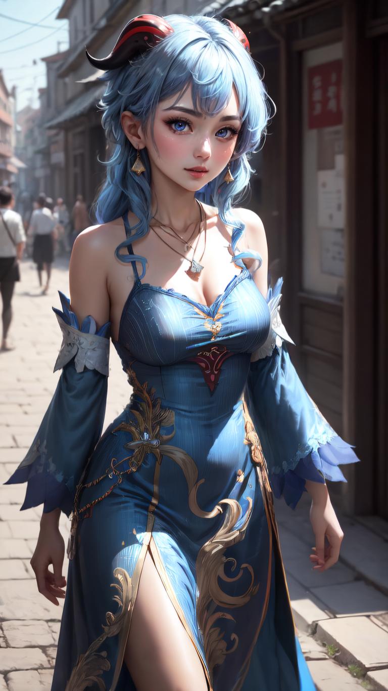 1girl, ahoge, bangs, bare shoulders, blue dress, blue eyes, blue hair, blurry, blurry background, building, cleavage, collarbone, cowboy shot, day, detached sleeves, dress, earrings, goat horns , horns, jewelry, large breasts, long hair, long sleeves, looking at viewer, medium breasts, necklace, outdoors, parted lips, pendant, realistic, side slit, solo, solo focus, standing, wide sleeves