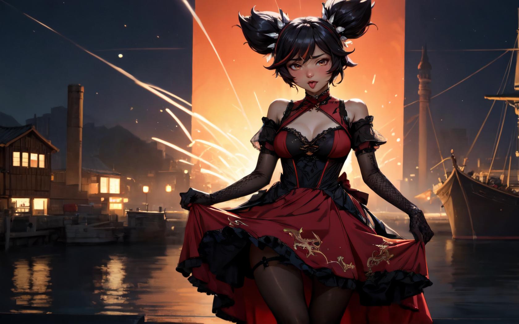 1girl, alternate costume, bangs, bare shoulders, black gloves, black hair, black pantyhose, blush, boat , cleavage, clothing cutout, dark skin, dark-skinned female, dress, elbow gloves, frills, gloves, looking at viewer, medium breasts, multicolored hair, night, night sky, pantyhose, red dress, red eyes, red hair, ship, short twintails, skirt hold, sky, solo, spikes, star (sky), starry sky, streaked hair, tongue, tongue out, twintails, water, watercraft