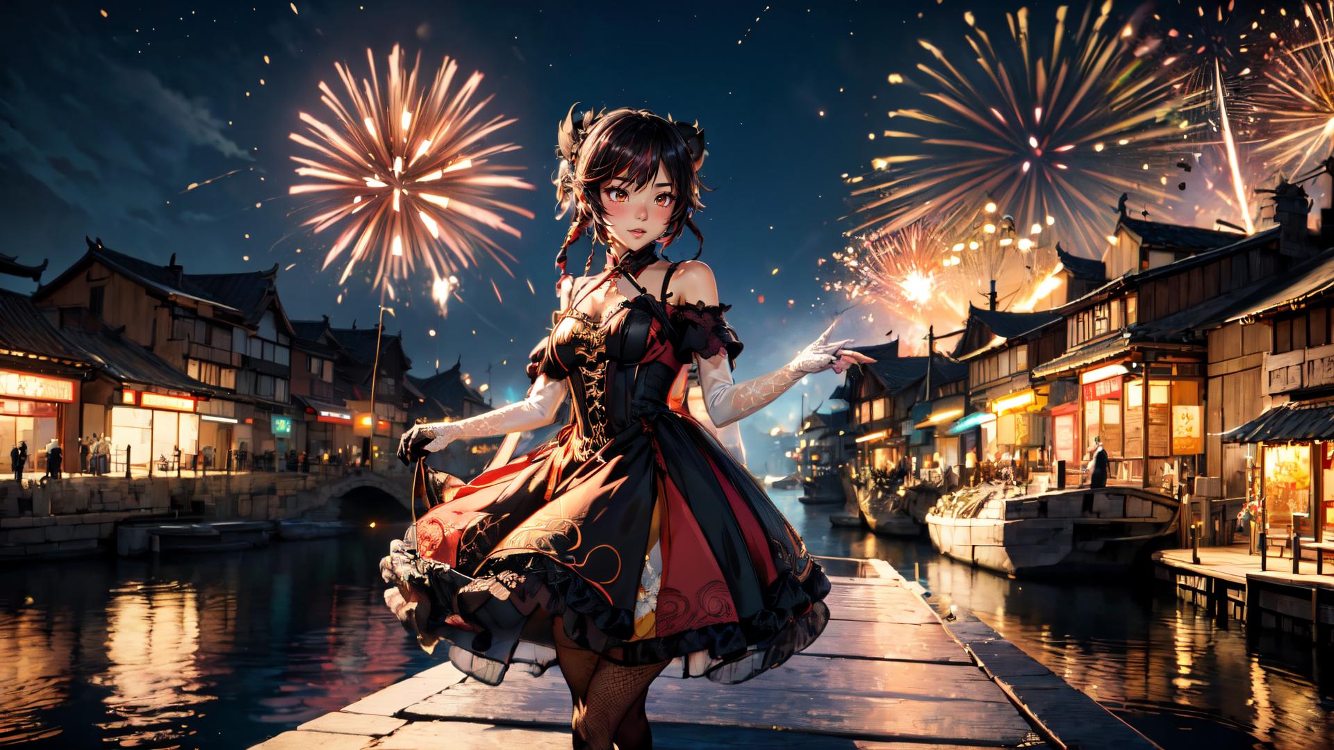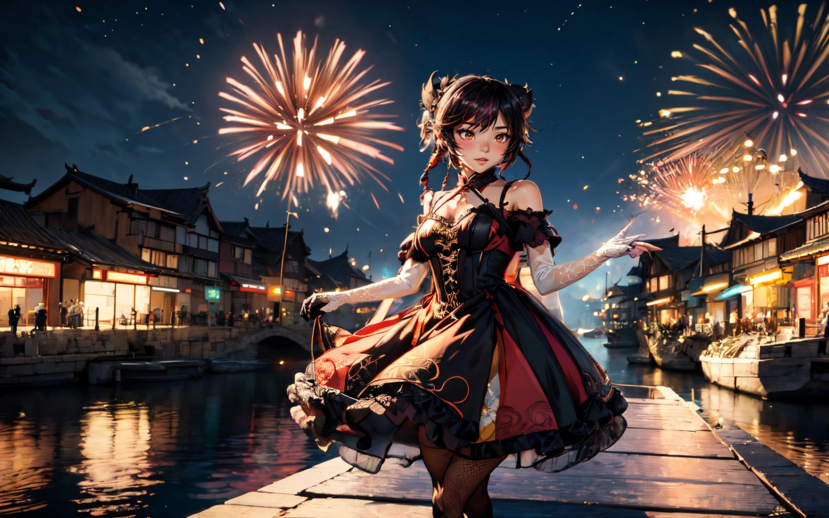 1girl, aerial fireworks, architecture, bangs, bare shoulders, black dress, black hair, blush, boat, bridge, building, cleavage, criss-cross halter, double bun, dress, east asian architecture, elbow gloves, fireworks, fishnets, frilled dress, frills, gloves, hair bun, hair ornament, halter dress, halterneck, jewelry, lantern, medium breasts, night, night sky, open mouth, outdoors, pantyhose, red eyes, reflection, reflective water , scenery, short hair, skirt hold, sky, sleeveless, sleeveless dress, smile, solo, standing, town, water, watercraft, white gloves