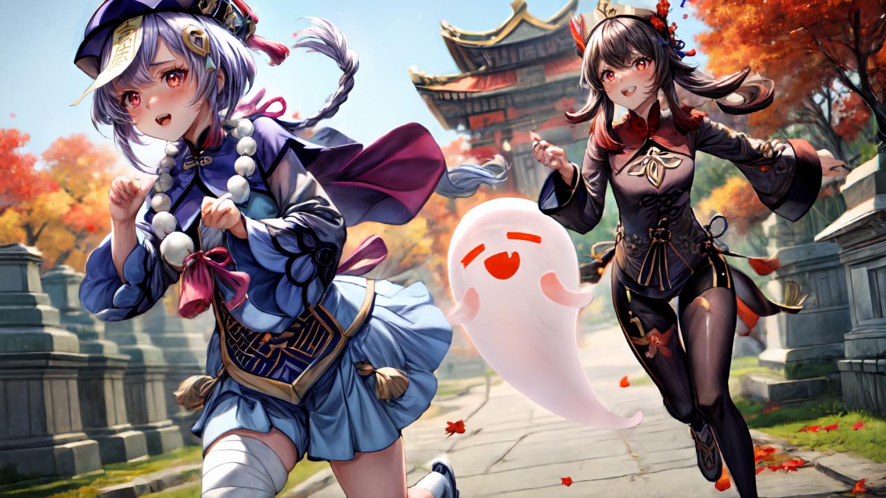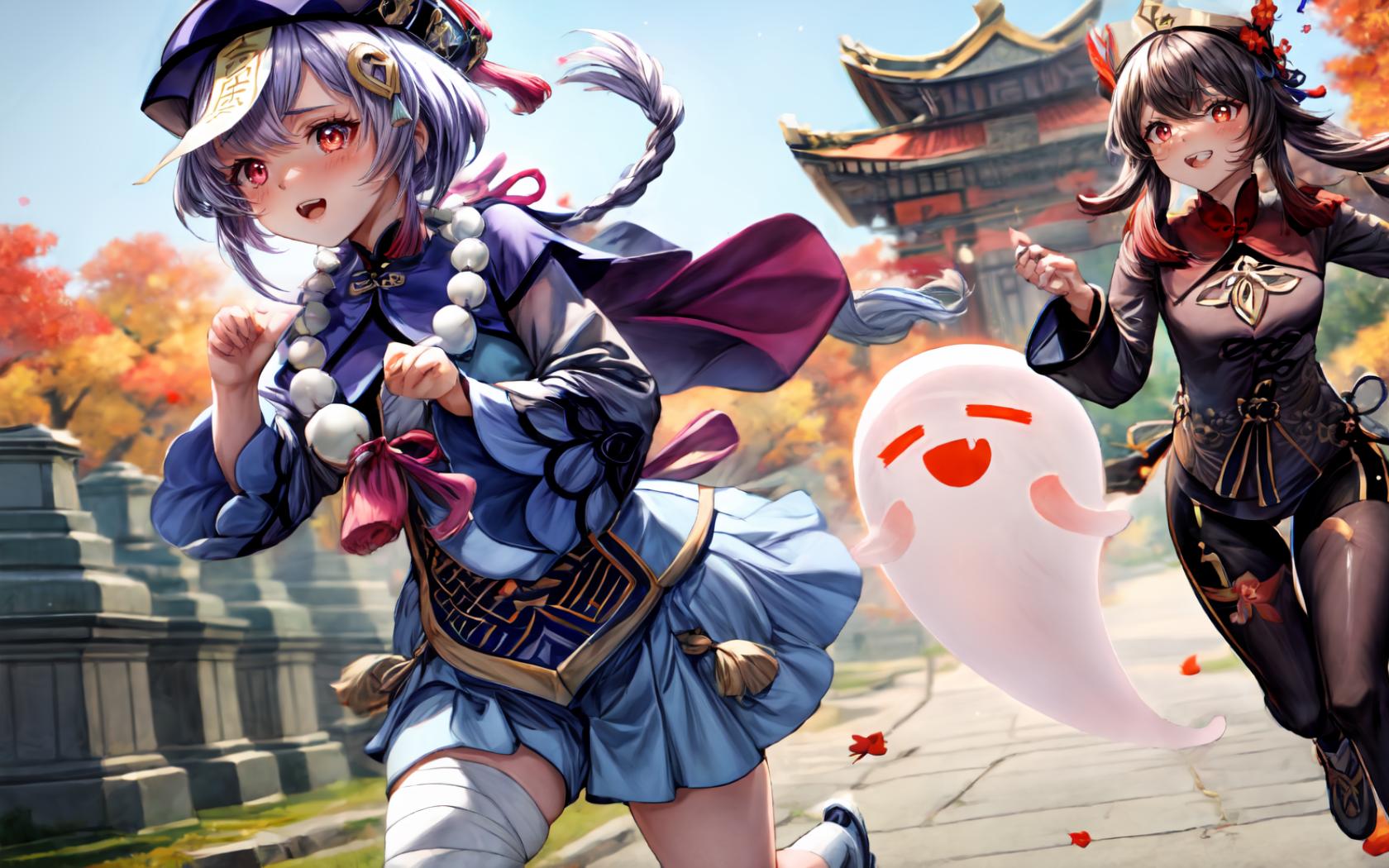 | Prompt | 2girls running, mapple trees, autumn, fall, mapple leaves in the wind, in chinese medieval street, ((front of chinese funerarium)), (dynamic, motion blur, depth of field:1.2), best quality,sharp focus,(8k), (4k),(Masterpiece), (Best Quality), extremely detailed, intricate, hyper detailed, (perfect face), ray tracing, light particles, <lora:more_details:0.2> ADDCOMM <lora:qiqi1:0.8> ((qiqidef)) running, afraid, bandages, screaming, ADDCOL <lora:hutao1-000009:0.8> hutaodef,grin, hat,(boo tao (genshin impact), ghost), |