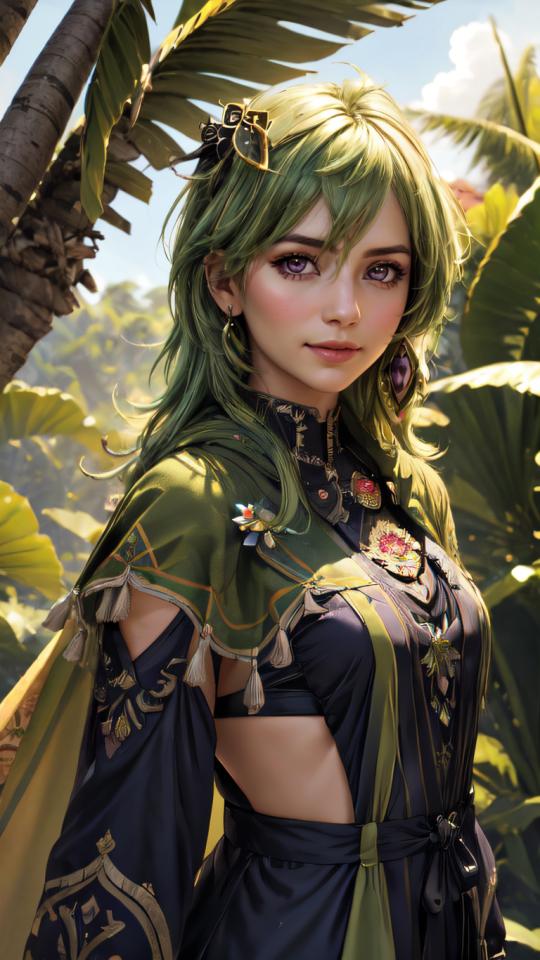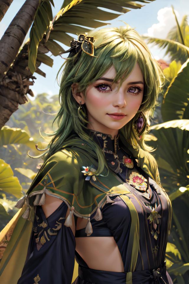 Prompt <lora:collei2-000008:1> ((colleidef)),green hair,purple eyes, ((close)) side view, hair in the wind,((wind)), staring at viewer, sweet, cute, light smile, deep intensive benevolent glance, jungle background, palm trees, coconut tree, birds, jungle birds, wildlife,
