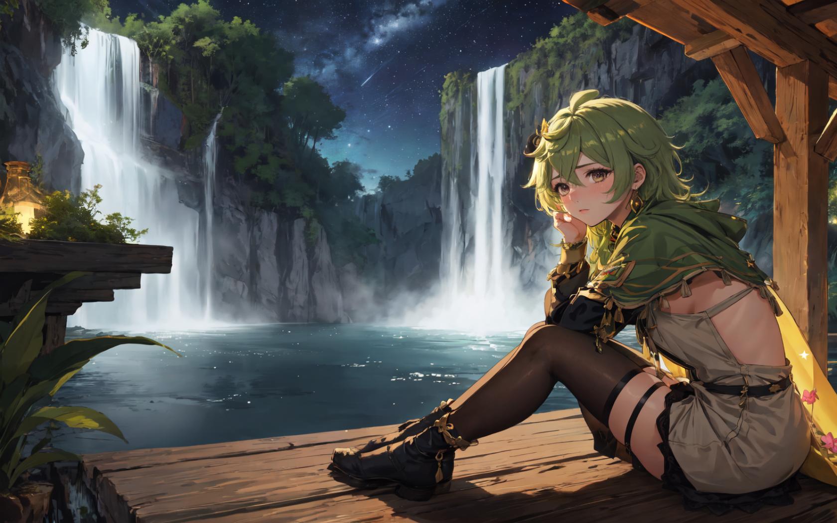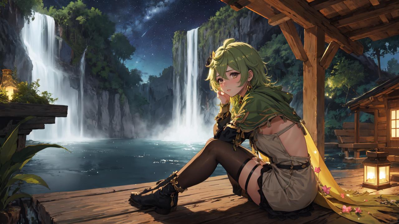 1girl, backless outfit, bangs, black footwear, black thighhighs, boots, brown eyes, brown thighhighs, capelet, dress, earrings, flower, green capelet , green hair, hair between eyes, jewelry, lantern, long hair, long sleeves, looking at viewer, looking to the side, medium hair, night, night sky, outdoors, sitting, sky, solo, star (sky), starry sky, thigh strap, thighhighs, tree, water, waterfall