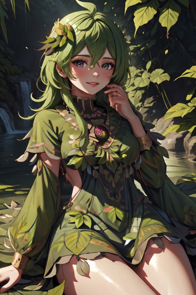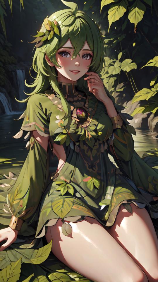 1girl, ahoge, bangs, blush, capelet, crossed bangs, detached sleeves, dress, flower, green capelet , green dress, green hair, grey eyes, hair between eyes, hair flower, hair ornament, hand up, jewelry, leaf, long hair, long sleeves, looking at viewer, medium breasts, nature, outdoors, parted lips, purple eyes, sitting, smile, solo, water