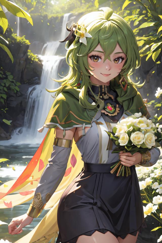 1girl, ahoge, bangs, black skirt, black thighhighs, blush, bouquet, brooch, brown eyes, brown thighhighs, capelet, closed mouth, cowboy shot, crossed bangs, day, detached sleeves, earrings, flower, gem, green capelet , green hair, hair between eyes, hair flower, hair ornament, high-waist skirt, holding, holding bouquet, holding flower, jewelry, leaf, long hair, long sleeves, looking at viewer, medium hair, outdoors, petals, shirt, shirt tucked in, skindentation, skirt, smile, solo, standing, thighhighs, water, waterfall, white flower, white rose, white shirt, yellow eyes, zettai ryouiki
