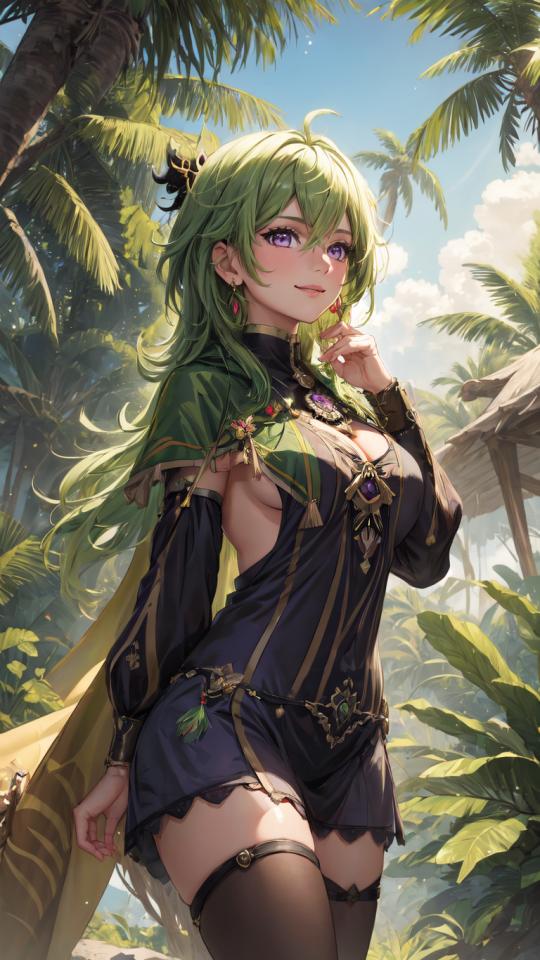 1girl, ahoge, arm behind back, bangs, beach, black dress, black thighhighs, blue sky, blush, brown thighhighs, capelet, cleavage, cloud, cowboy shot, crossed bangs, day, detached sleeves, dress, earrings, green capelet , green hair, hair between eyes, hand up, jewelry, long hair, long sleeves, looking at viewer, medium breasts, outdoors, palm tree, parted lips, purple eyes, short dress, sideboob, skindentation, sky, smile, solo, standing, sunlight, tassel, thighhighs, tree, zettai ryouiki