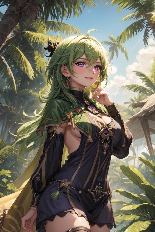 | Prompt | <lora:collei2-000008:0.8> colleidef,green hair,purple eyes,