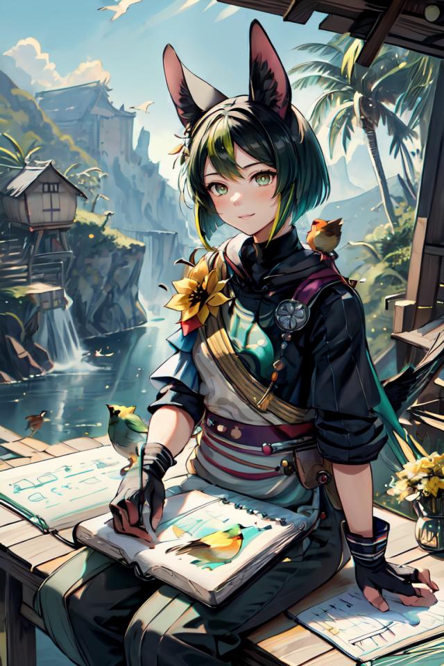 | Prompt | <lora:tighnari:0.7>close view of tighnari (genshin impact),, 1boy, animal ears, male focus, multicolored hair, yellow flower, black hair, green hair, green eyes, gloves, animal ear fluff, solo, blunt ends, asymmetrical sleeves,