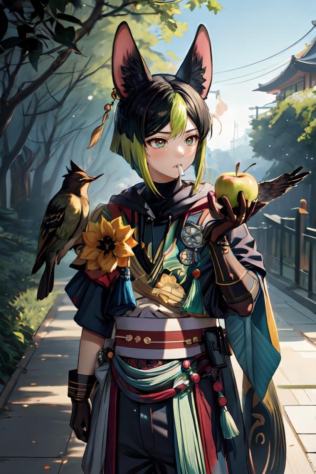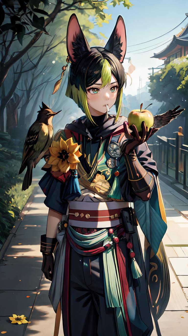 Prompt <lora:tighnari:0.7> tighnari (genshin impact),, 1boy, animal ears, male focus, multicolored hair, yellow flower, medal, fox ears, black hair, green hair, green eyes, gloves, bird, flower, animal ear fluff, solo, blunt ends, vision (genshin impact), asymmetrical sleeves, fox boy, tassel, eating apple, bird on shoulder,cute,kawai,