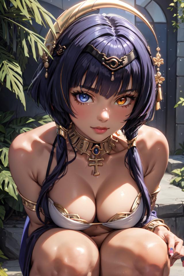 1girl, ankh, armlet, bangs, bare shoulders, bikini, blue eyes, blue hair, blush, bracelet, circlet, cleavage, closed mouth, collarbone, cross, dark skin, dark-skinned female, egyptian clothes, eye of horus , hair ornament, hair over shoulder, hairband, heterochromia, jewelry, large breasts, long hair, looking at viewer, medium breasts, nail polish, navel, neck ring, sandals, sidelocks, solo, squatting, stomach, twintails, yellow eyes