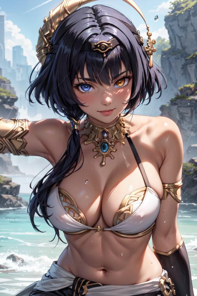 1girl, armlet, bangs, bare shoulders, bikini, black hair, black hairband, black shorts, blue eyes, blue sky, blush, brooch, cleavage, closed mouth, collarbone, dark skin, dark-skinned female, day, eye of horus , gloves, hair ornament, hair over shoulder, hairband, heterochromia, jewelry, large breasts, long hair, looking at viewer, navel, neck ring, outdoors, short hair with long locks, short shorts, shorts, sitting, sky, smile, solo, stomach, swimsuit, thighlet, water, wet, white bikini, yellow eyes