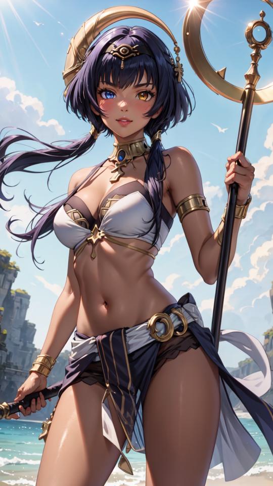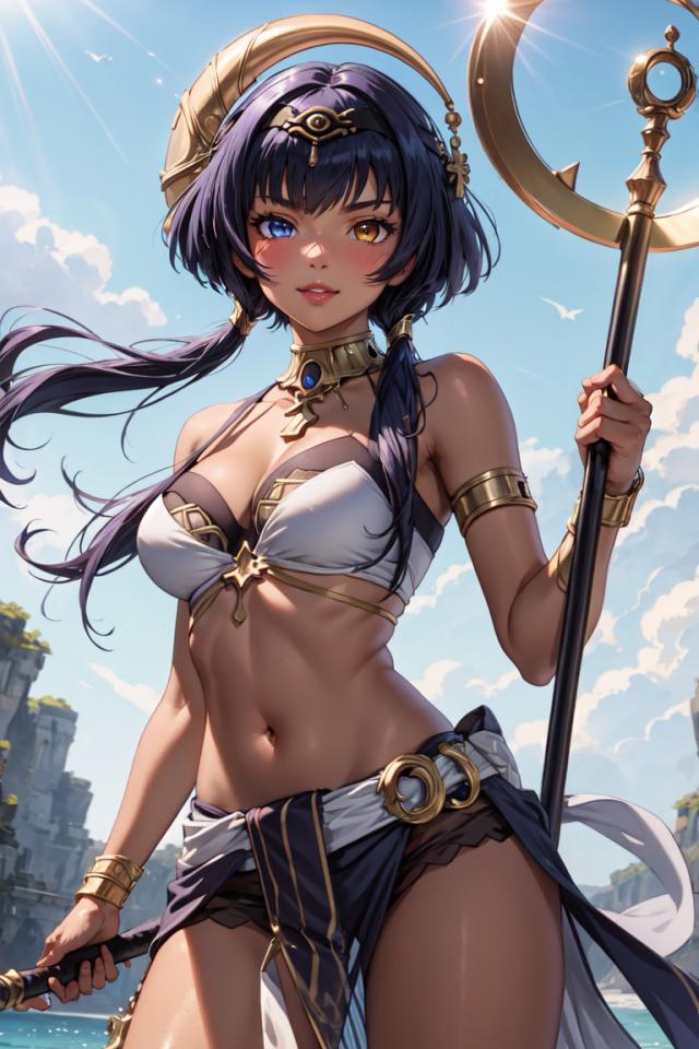 1girl, armlet, bangs, bare shoulders, black hairband, blue eyes, blue hair, blue sky, blush, cleavage, cloud, cowboy shot, dark skin, dark-skinned female, day, egyptian clothes, eye of horus , floating hair, glint, gold trim, hair ornament, hairband, heterochromia, holding, holding polearm, holding weapon, jewelry, long hair, looking at viewer, low twintails, medium breasts, navel, neck ring, open mouth, outdoors, parted lips, pelvic curtain, polearm, short hair with long locks, sidelocks, sky, smile, solo, standing, stomach, sunlight, twintails, upper teeth only, weapon, yellow eyes