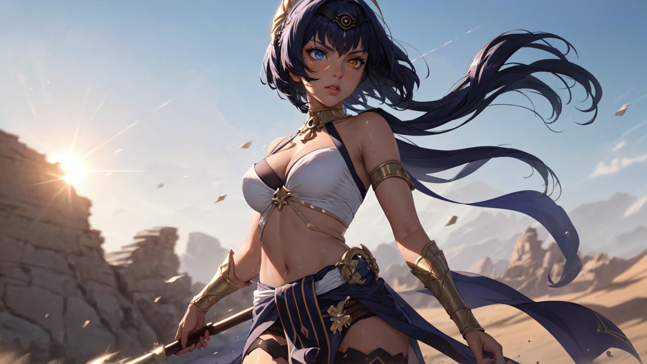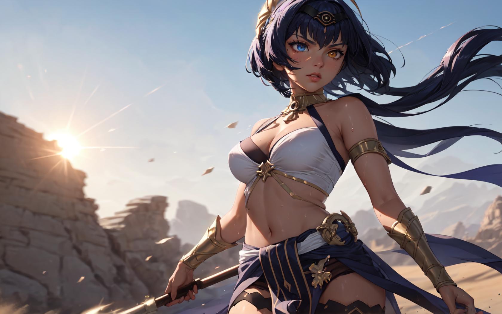 1girl, armlet, bangs, bare shoulders, black hairband, blue eyes, blue hair, blue sky, bracer, cleavage, cowboy shot, dark skin, dark-skinned female, desert, egyptian clothes, eye of horus , floating hair, hair ornament, hairband, halterneck, heterochromia, holding, holding polearm, holding weapon, jewelry, long hair, looking at viewer, medium breasts, navel, neck ring, outdoors, parted lips, polearm, short hair with long locks, sky, solo, spear, stomach, weapon, yellow eyes