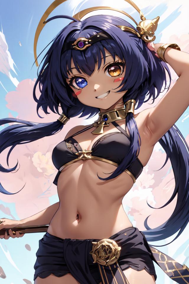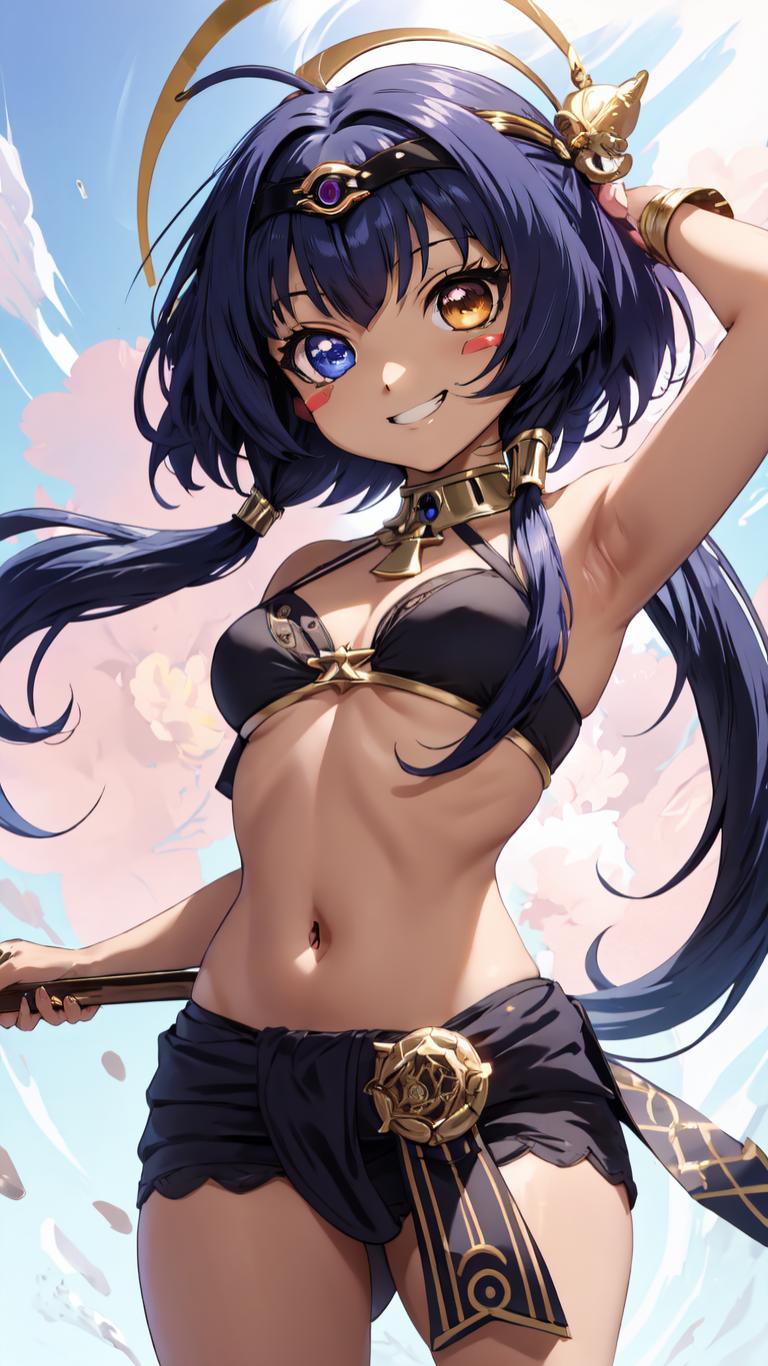 1girl, ahoge, arm behind head, arm up, armpits, bangs, bare arms, bare shoulders, black hairband, blue eyes, blue hair, brooch, cowboy shot, dark skin, dark-skinned female, eye of horus , gold trim, grin, hair ornament, hairband, heterochromia, holding, jewelry, long hair, looking at viewer, low twintails, medium breasts, navel, neck ring, short hair with long locks, shorts, sidelocks, small breasts, smile, solo, stomach, twintails, weapon, yellow eyes