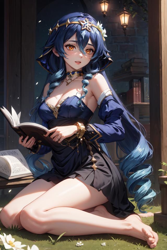 1girl, armpit crease, bangs, bare legs, bare shoulders, barefoot, black dress, blue hair, blue sleeves, book, chain, choker, circlet, cleavage, detached sleeves, dress, drill hair, drill locks, feet, flower, full body, gold choker , gold trim, grass, hair between eyes, hair ornament, holding, holding book, jewelry, legs, long hair, long sleeves, medium breasts, neck ring, necklace, open book, open mouth, orange eyes, parted lips, puffy long sleeves, puffy sleeves, ringlets, short dress, sidelocks, sitting, sleeveless, smile, solo, toes, twin drills, twintails, upper teeth only, very long hair, white flower, yokozuwari