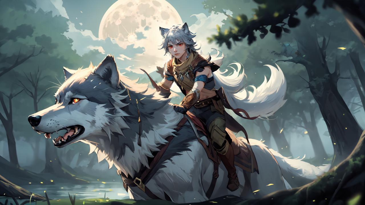 1boy, animal, animal ears, bangs, belt, boots, brown gloves, fingerless gloves, forest, full moon, gloves, green pants, grey hair, jewelry, long hair, male focus, moon, nature, night, open mouth, outdoors, pants, red eyes, riding, tail, tooth necklace , tree, wolf, wolf boy, wolf ears