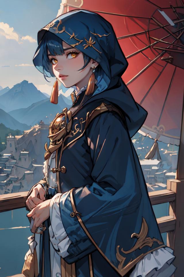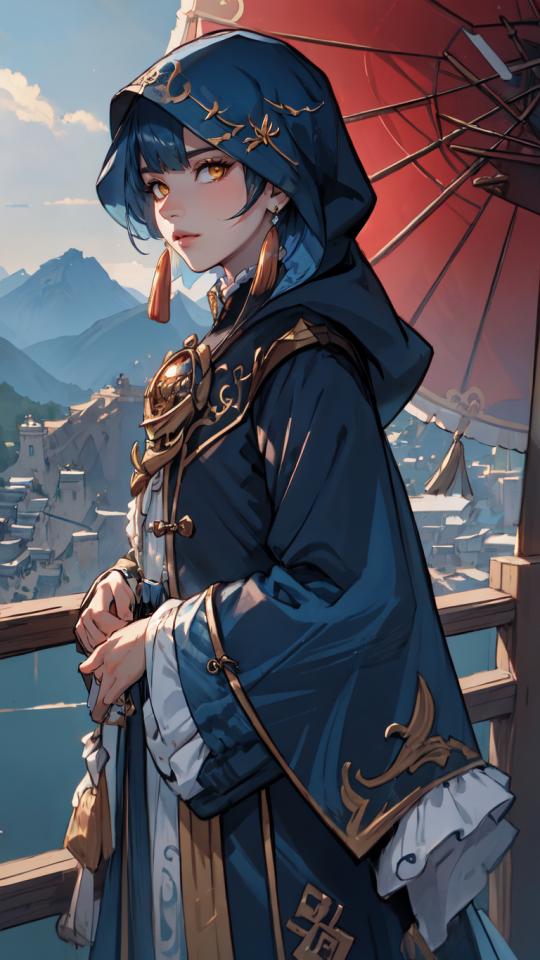 1boy, bangs, blue coat , blue hair, chinese clothes, closed mouth, cloud, day, earrings, eyelashes, frilled sleeves, frills, from side, gold trim, holding, holding umbrella, hood, hood up, jewelry, long sleeves, looking at viewer, looking to the side, male focus, mountain, oil-paper umbrella, orange eyes, outdoors, railing, short hair, single earring, sky, solo, tassel, tassel earrings, umbrella, wide sleeves, yellow eyes