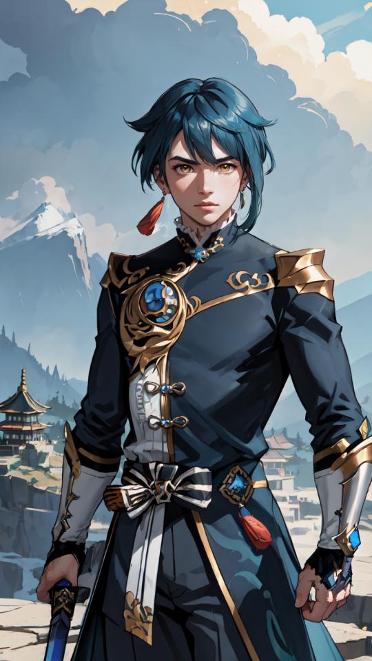 1boy, architecture, bangs, blue hair, chinese clothes, closed mouth, cloud, cloudy sky, cowboy shot, day, earrings, east asian architecture, fingerless gloves, frills, gloves, holding, holding sword, holding weapon, jewelry, long sleeves, looking at viewer, male focus, mountain, outdoors, pants, serious, short hair, single earring, sky, solo, sword, tassel, tassel earrings , vision (genshin impact), weapon, yellow eyes