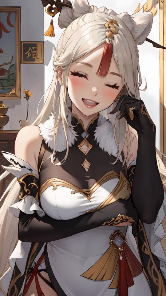 1girl, :d, arm under breasts, bangs, bare shoulders, black gloves, blush, china dress, chinese clothes, claw ring, closed eyes, dress, elbow gloves, facing viewer, fur collar, gloves, hair ornament, hair stick, hairpin, large breasts, long hair, medium breasts, open mouth, parted bangs, sidelocks, sleeveless, smile, solo, tassel, tassel hair ornament , upper teeth only, very long hair, vision (genshin impact), white dress, white hair