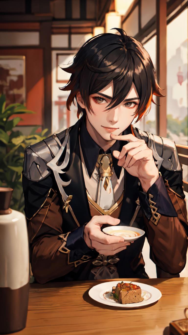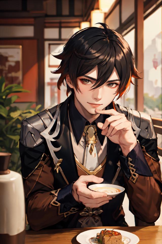 Prompt <lora:sitac-000016:1> elbows on table, <lora:zhongli:0.8> zhongli (genshin impact), 1boy, male focus, solo, ((male focus)),happy, relaxed,smiling, inside a chinese tea room,traditional chinese tea,