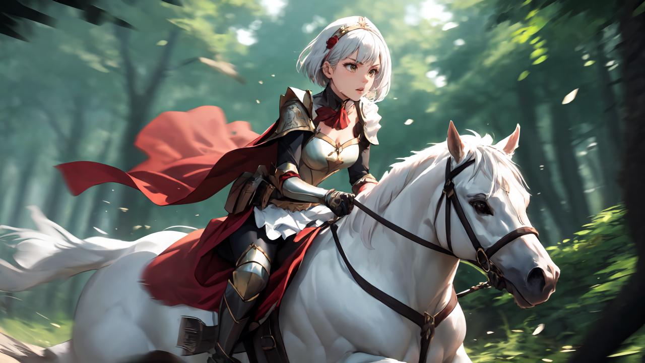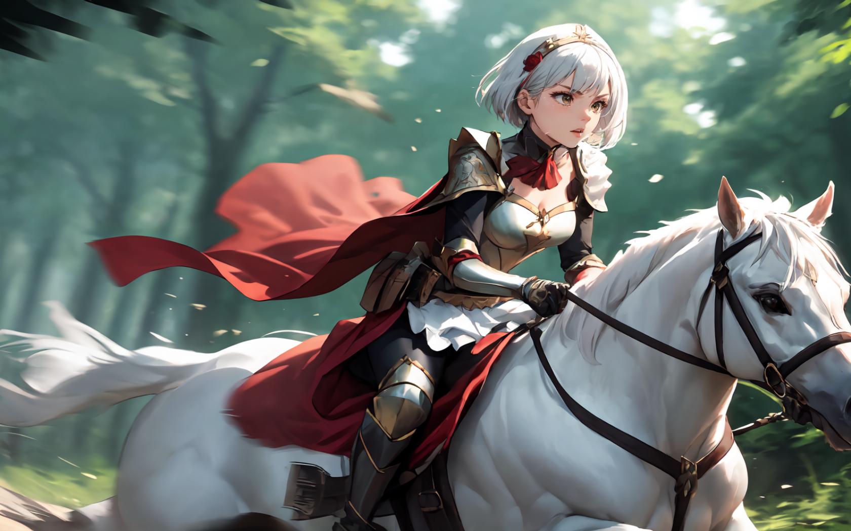 | Prompt | <lora:noelle1:0.8> noelledef, , short white hair,red cape in the wind, shiny ornate armor,looking front of her,