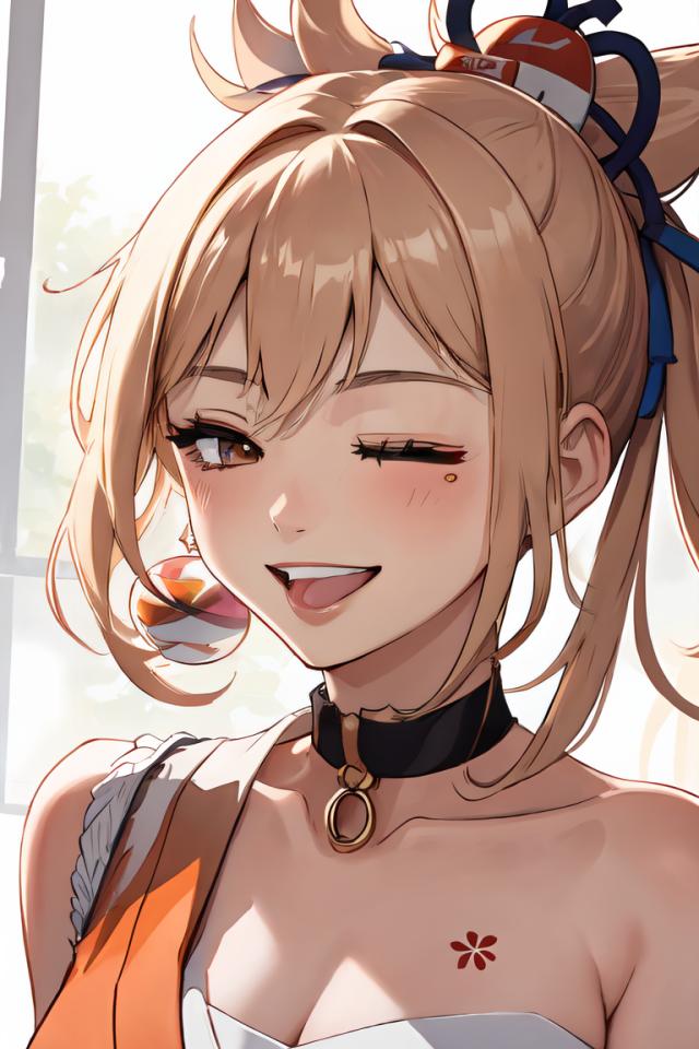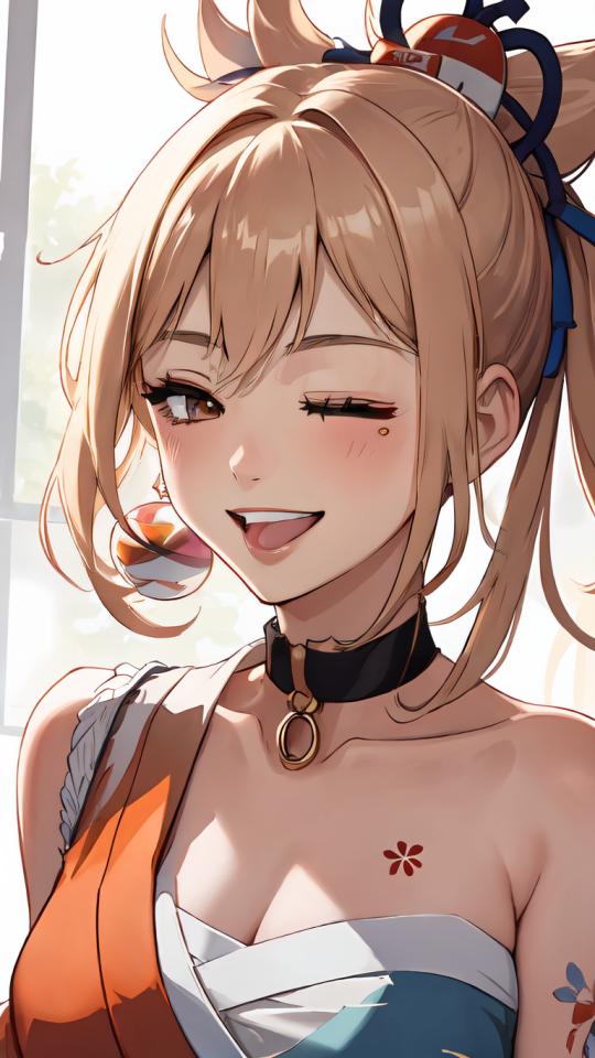 Prompt <lora:yoimiya2:0.8> yoimiyadef, <lora:ddw_v1:0.7>((wink, one eye closed:1.4)),playful smile,seductive, happy, playful,