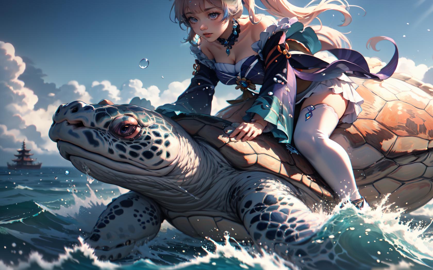 <lora:riding_a:0.2>((riding on a detailed realistic sea turtle)),