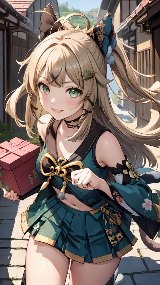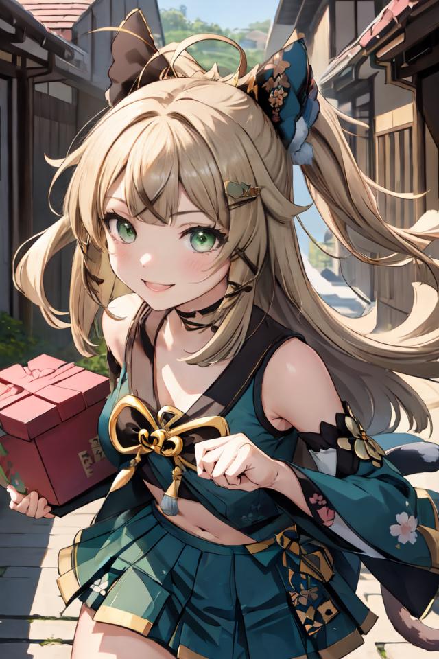 | Prompt | <lora:kirara1:1>kiraradef,cat girl,tail, solo, green eyes, paw shoes, long hair, hair ornament, bare shoulders, bow, cat ears, hair bow, sleeveless dress,