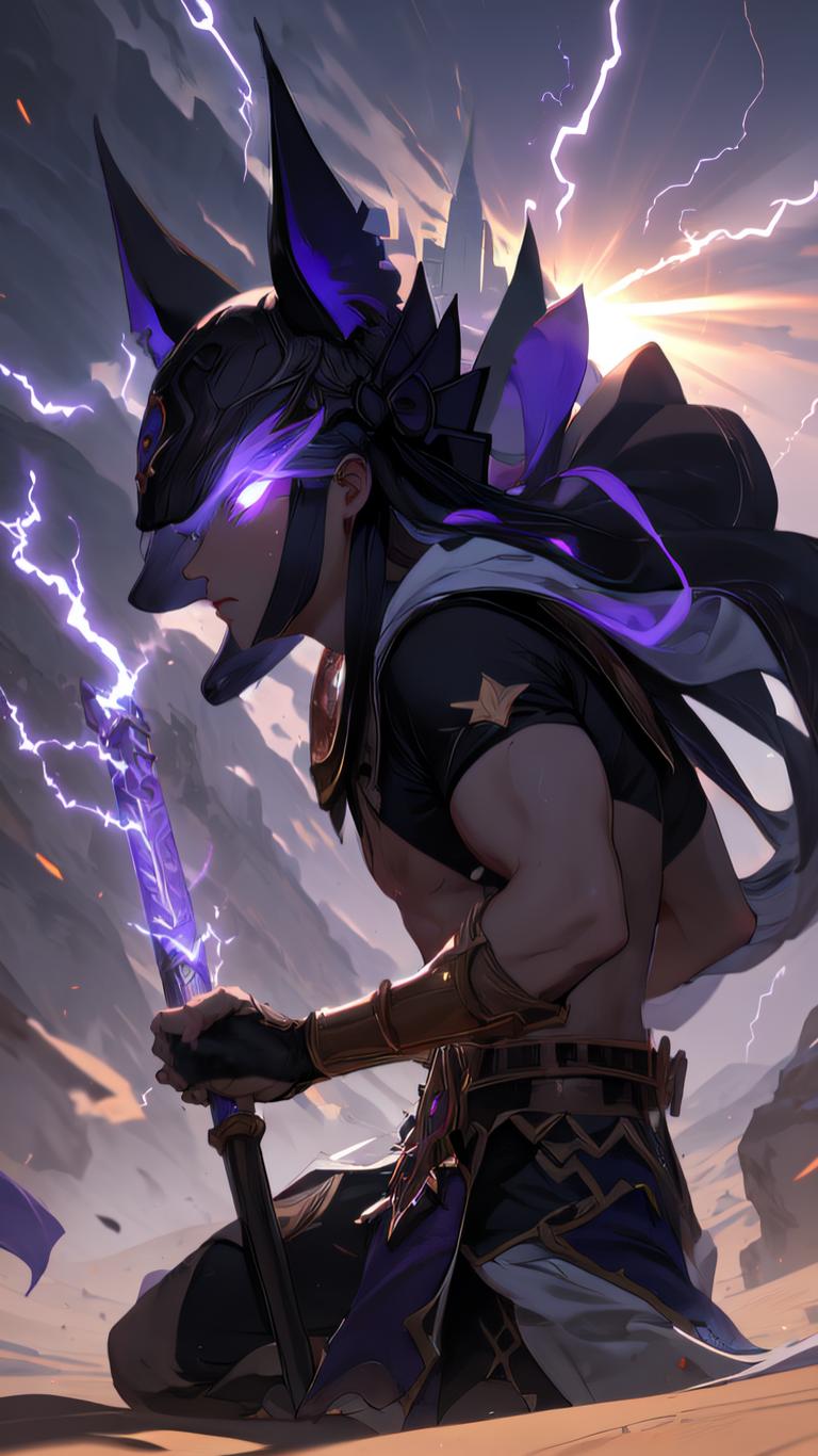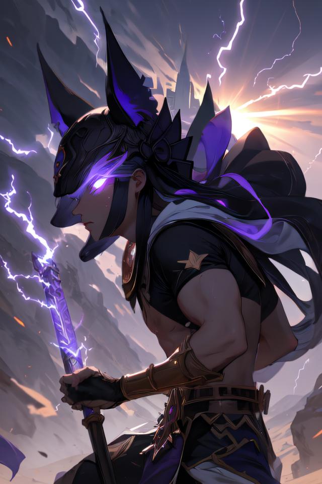 1boy, animal ears, black hair, bridal gauntlets, closed mouth, cloud, cloudy sky, electricity, fox ears, from side, gloves, glowing, glowing eye, glowing eyes, helmet, holding, holding polearm, holding weapon, jackal ears , lightning, long hair, male focus, outdoors, polearm, profile, purple eyes, short sleeves, sky, solo, weapon