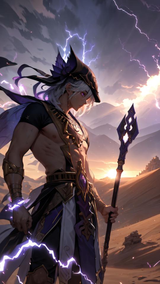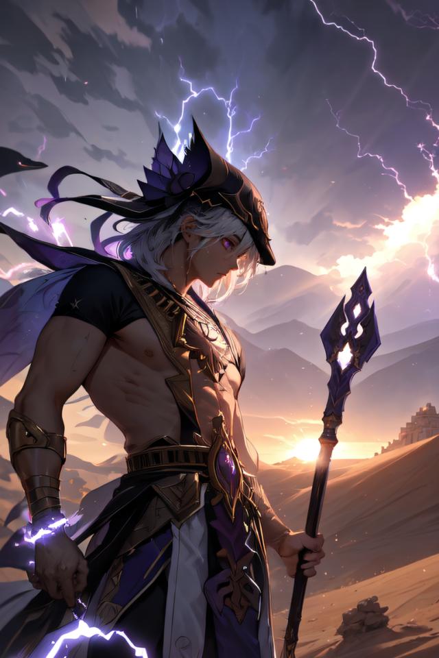 1boy, animal hat, arabian clothes , bangs, black headwear, clenched hand, closed mouth, cloud, cloudy sky, cowboy shot, dark skin, dark-skinned male, egyptian clothes, electricity, glowing, hat, holding, holding polearm, holding staff, holding weapon, jackal ears, jewelry, lightning, long hair, male focus, mountain, necklace, nipples, outdoors, pants, polearm, profile, purple eyes, sand, short sleeves, sky, solo, staff, standing, sunset, sweat, weapon, white hair